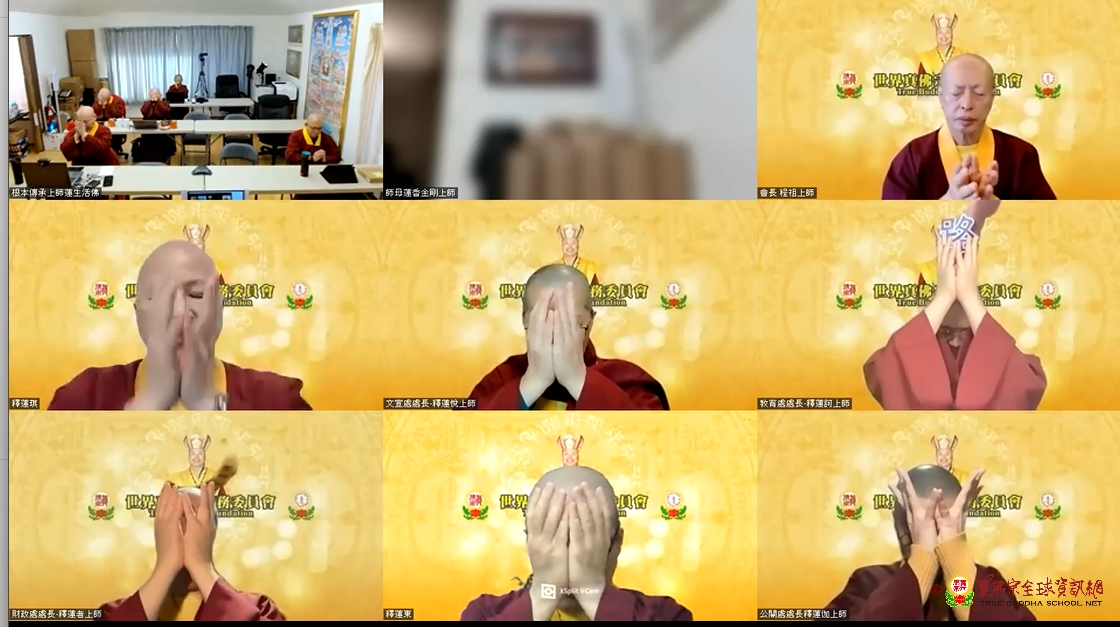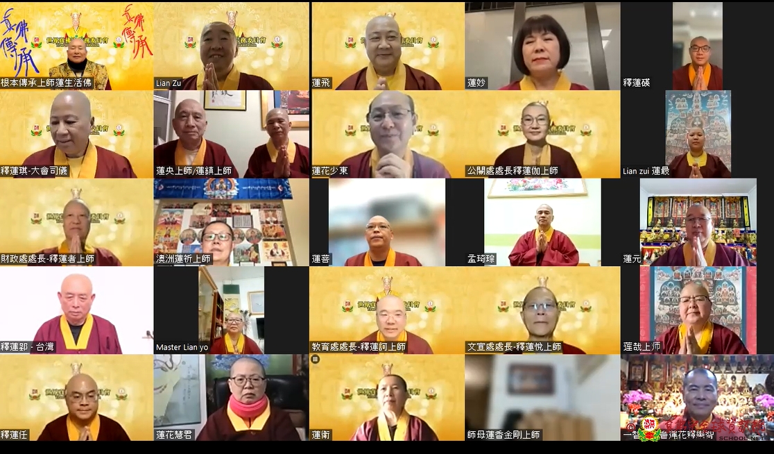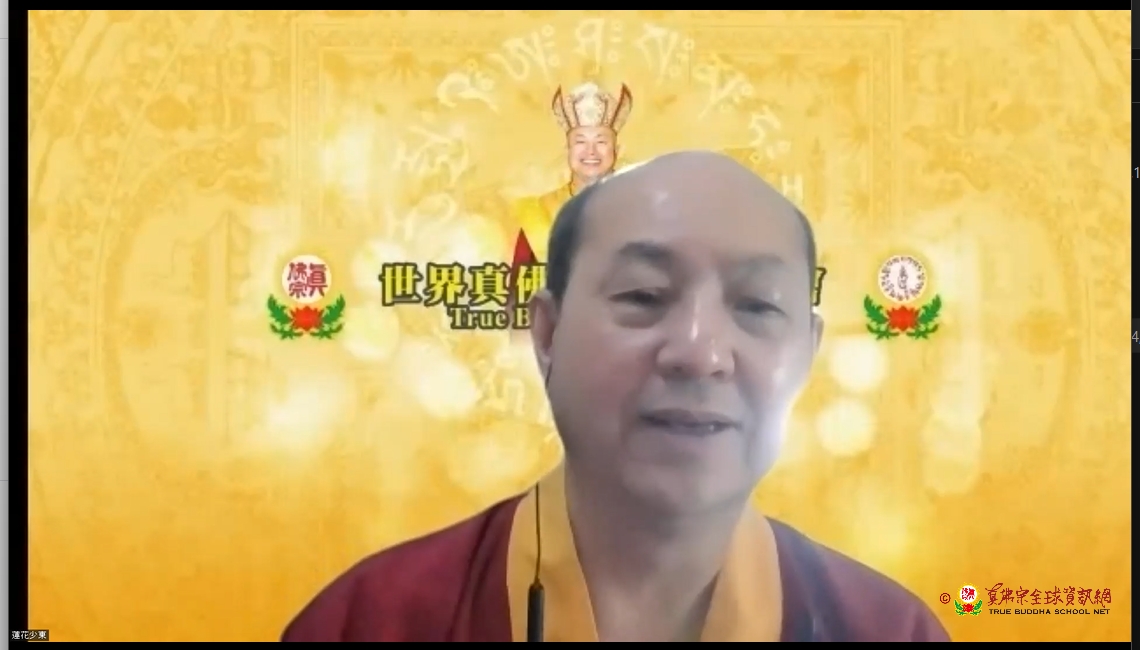 在會長程祖上師總結各處上師報告中,迎來根本上師蓮生活佛的蒞臨,師尊輕鬆地在視頻中和上師們聊天,強調學密教修氣瑜珈的重要,並關懷上師們的健康情形,根本上師開朗笑談中,時時觸動弟子們的心,處處流露慈悲心懷與智慧的指引。