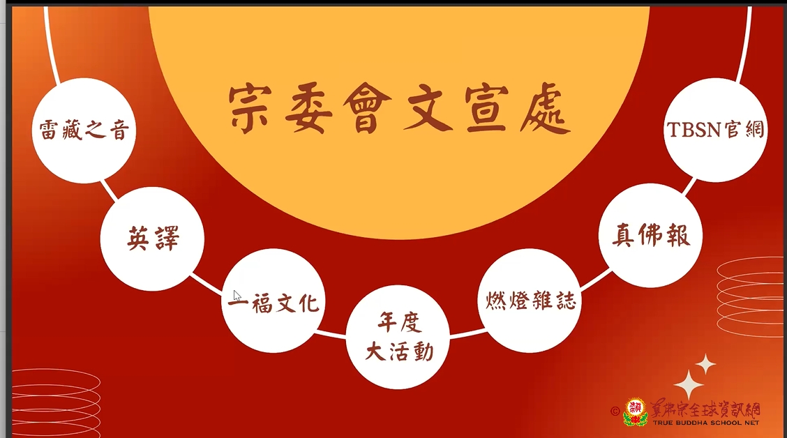 文宣處蓮悅上師介紹文宣處會務,包含年度大活動、雷藏之音、英譯、一福文化、三大中央文宣:真佛宗全球資訊網、真佛報、燃燈雜誌,介紹了真佛報此次與八大網路媒體平台結合,報導真佛宗位土耳其的持大救難咒迴向及賑災物資捐贈活動,規劃未來每個月做一次新聞推播,透過網路平台把真佛宗新聞分享到網路世界。