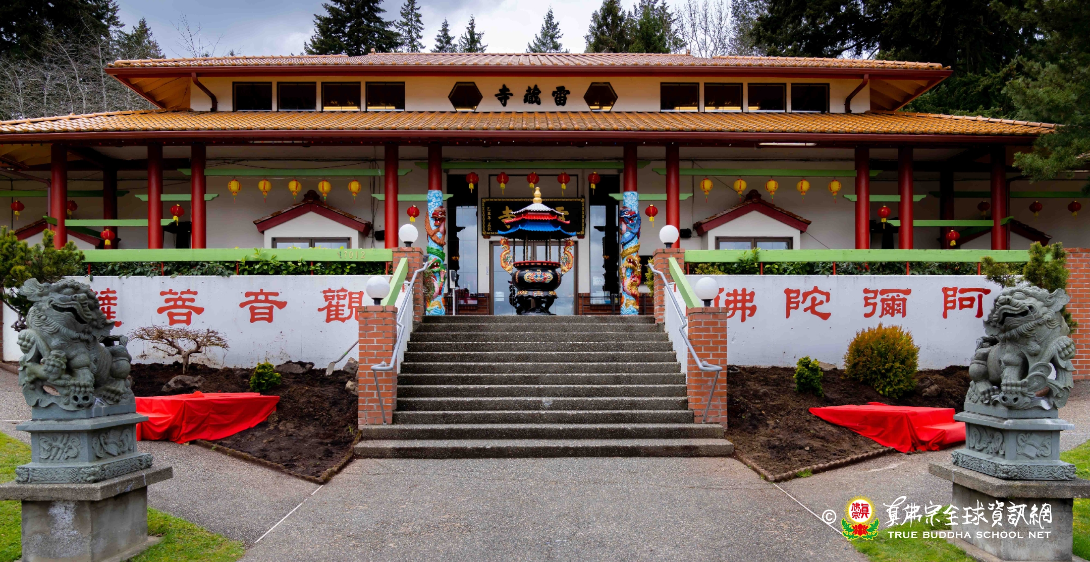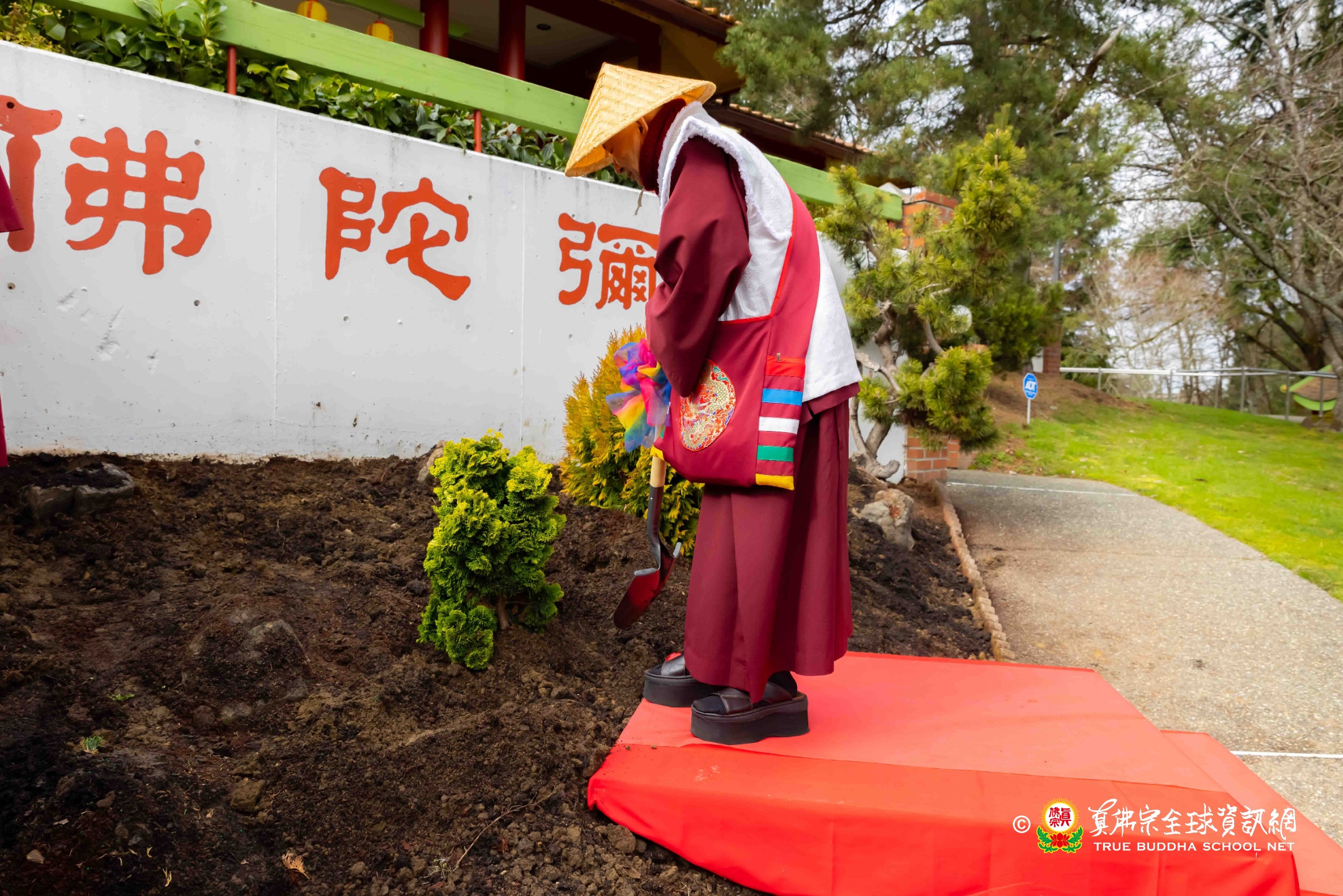 植樹節前夕2023年3月11日星期六午餐後,聖尊蓮生活佛與師母蓮香上師為祖廟西雅圖雷藏寺植新樹。