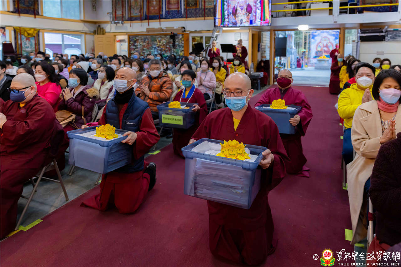 法王接着示範「千艘法船」的超渡,且表示從疫情開始至今,日日超渡,無一日間斷。首先法王祈請地藏王菩薩攝招有善根的幽冥衆,接着祈請護法諸尊,位列兩旁,再祈請三根本放光加持。接着請地藏王菩薩攝招幽冥衆引導在四週、請諸護法圍繞四週、金甲神在虛空中、瑤池金母放光加持、虎頭金剛放光加持、妙色身如來放光加持幽冥衆變化爲青春美貌。