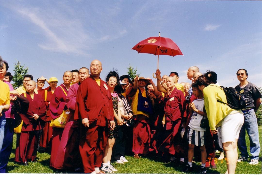 1994年8月6日,聖尊應邀為剛落成具密宗色彩的「白雲雷藏寺」開光及剪彩,同行有八位上師、兩位法師。開光當天,天降微微甘露,將8月浩熱的卡城,變得一片清凉,暑氣全消。當9時正,聖尊車隊蒞臨白雲雷藏寺時,大日從雲層中沖破,頓時陽光普照,光芒萬象一片吉祥。寺外人山人海,喜氣洋洋,隨着聖尊金剪一揮,紅布卸下,露出了金光閃閃的「白雲雷藏寺」横匾,同時也象徵白雲雷藏寺弘法度眾的新開始。當天聖尊賜下墨寶「深入禪定是法王 白雲深處樂仙家」,並賜受出家戒和菩薩戒。