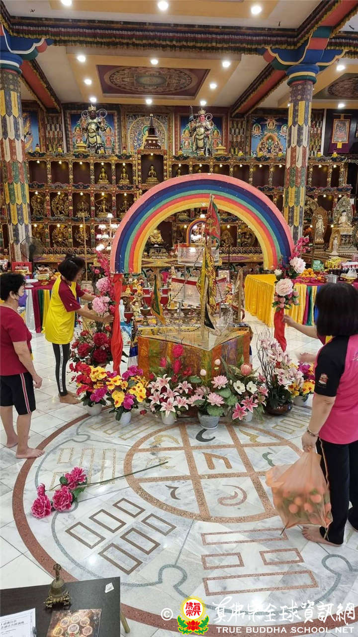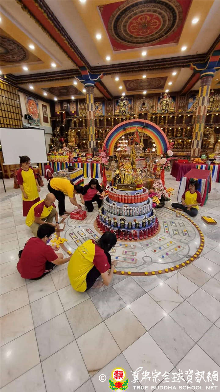 2023佛誕請佛住世薈供/水供法會 花絮報導 世界各地道場響應宗委會號召2023年6月24日全球雲端連線請佛住世薈供/水供法會,進入密集準備階段。 在馬來西亞真佛宗怡保雷藏寺,同門互相合作帮助为準備6月24日全球真佛宗水供大法會佈置金母水供莊嚴壇城。