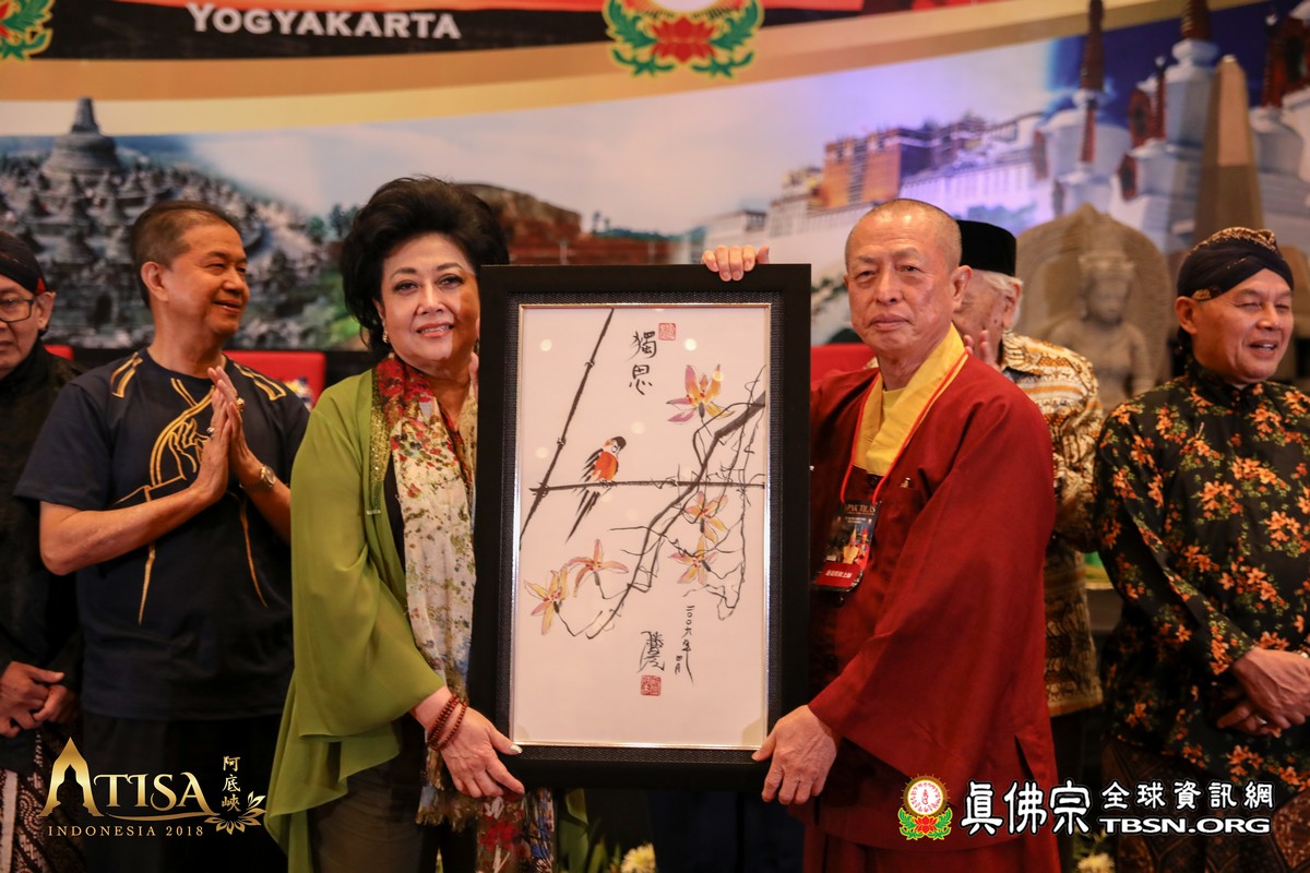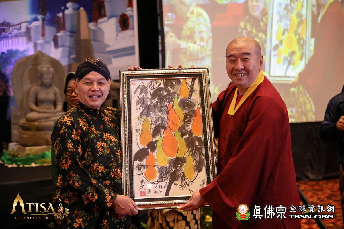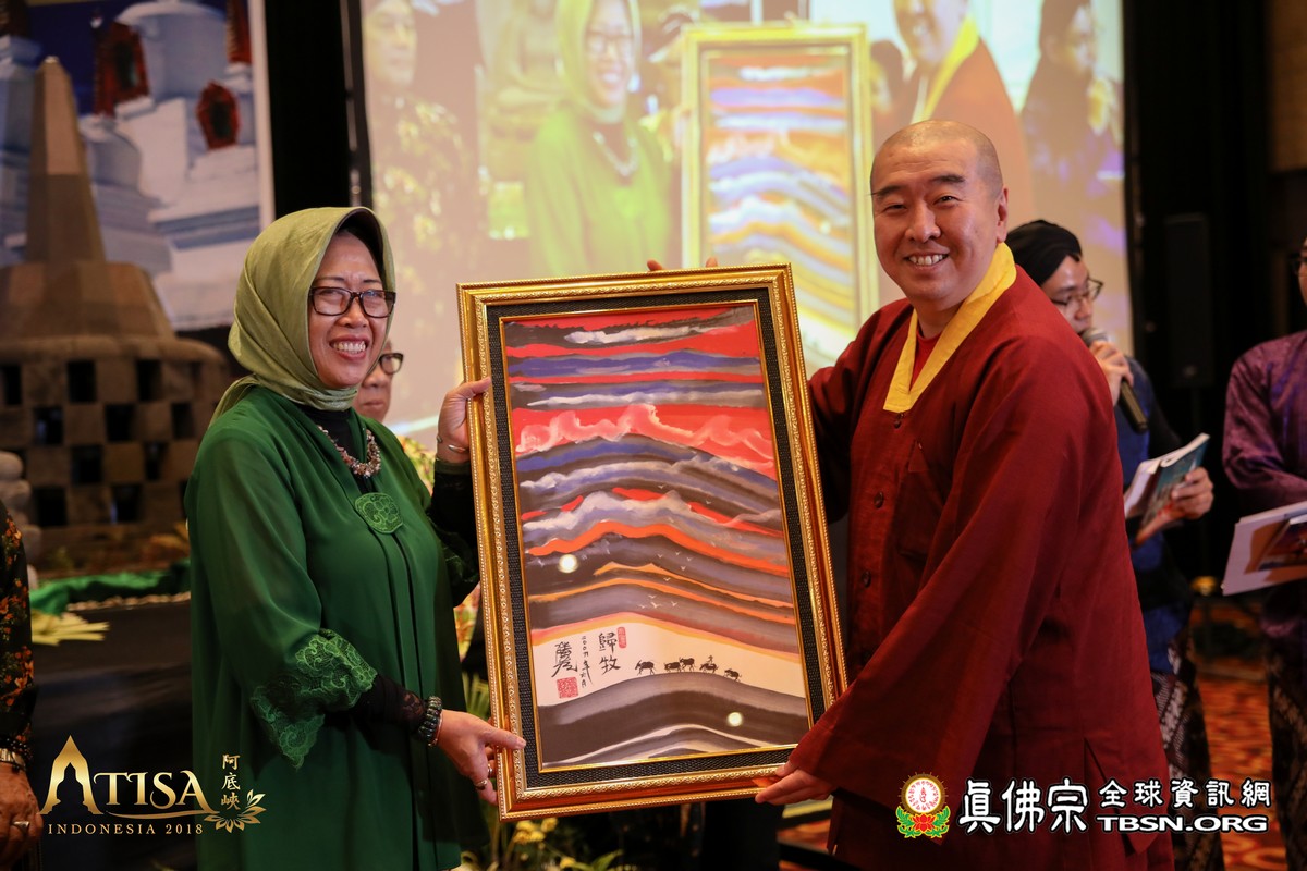 在所有致詞結束後,世界宗務委員會及印尼真佛宗密教總會、印尼真佛宗密教總協會,共同致贈5億元印尼盾給印尼佛教總會(WALUBI),用以協助印尼蘇拉威西海嘯重災區巴路(Palo)的賑災與重建,由總會長鄒麗英女士代表接受贈與。同時,主辦單位也將多幅蓮生活佛所創作之墨寶畫作,致贈予蒞臨活動的嘉賓們。場面歡愉溫馨,與會大眾無不希望下次的講座活動能早日舉行,讓大眾能再以多種不同角度來接近佛法、深入智慧,也期待聖尊蓮生活佛於12月佛駕印尼,主持12月8日於印尼雅加達地區舉行的阿底峽尊者大法會,並蒞臨印尼各地多處道場,以佛光加持這個千島之國。