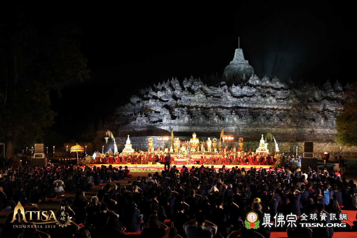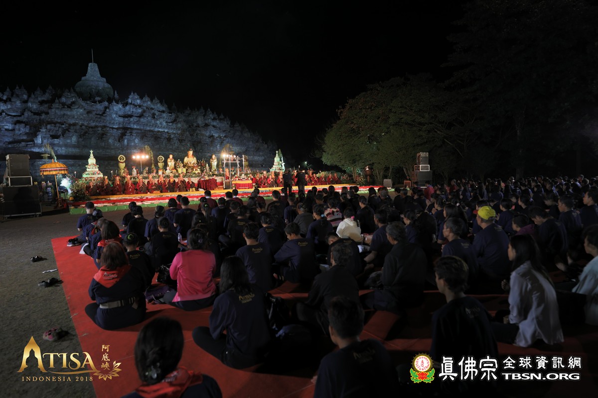 10月28日下午,與會大眾再次前往婆羅浮屠會場,參加由蓮僧上師主壇之「千手千眼觀世音菩薩護摩大法會」,為印尼國家祈福並為近日(9月28日)蘇拉威西島(Sulawesi)暨龍目地震海嘯的災民祈福超度。並由真佛宗上師團帶領與會大眾持誦大救難咒並繞塔、點燈為印尼國家祈福。