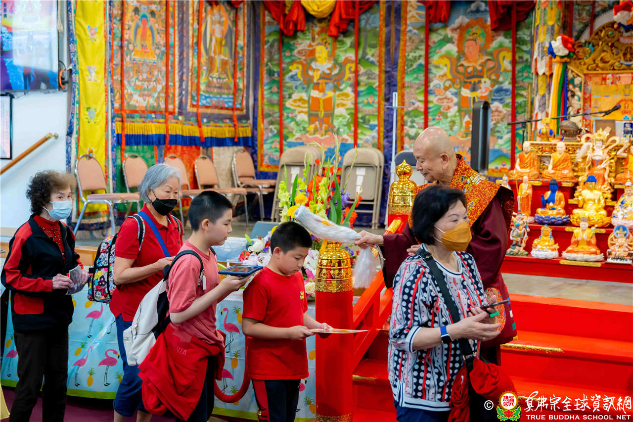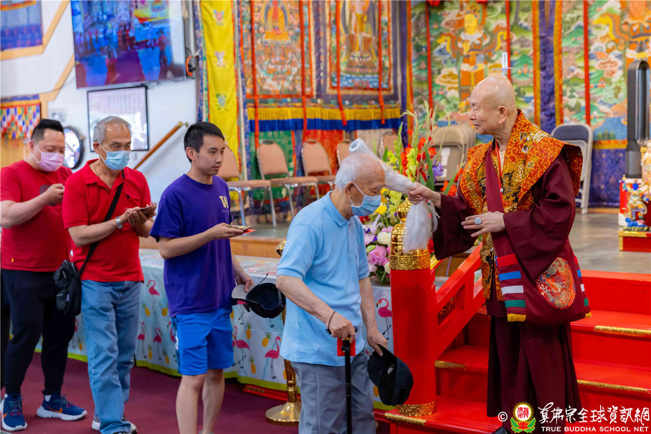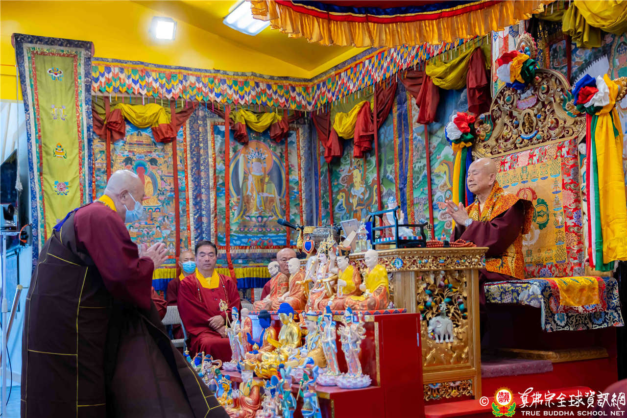 2023年6月25日,西雅圖彩虹雷藏寺恭請聖尊蓮生法王主壇長壽佛護摩法會。法王預告下個星期日護摩法會主尊為滿願童子,接著向大家講解滿願童子的咒語和手印。