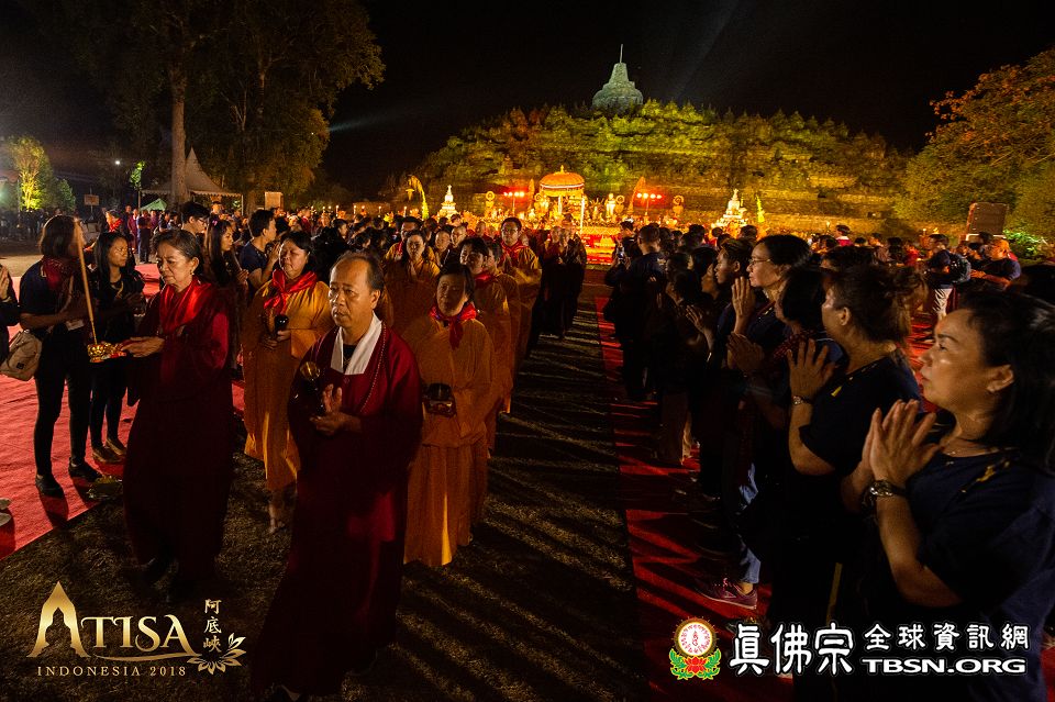 接著,在殊勝的「大救難咒」音樂之中,上師與各級弘法人員、與會大眾和貴賓們,一起虔誠一步一腳印地繞著婆羅浮圖佛塔,人人萬分殷重,觀想持咒繞佛。