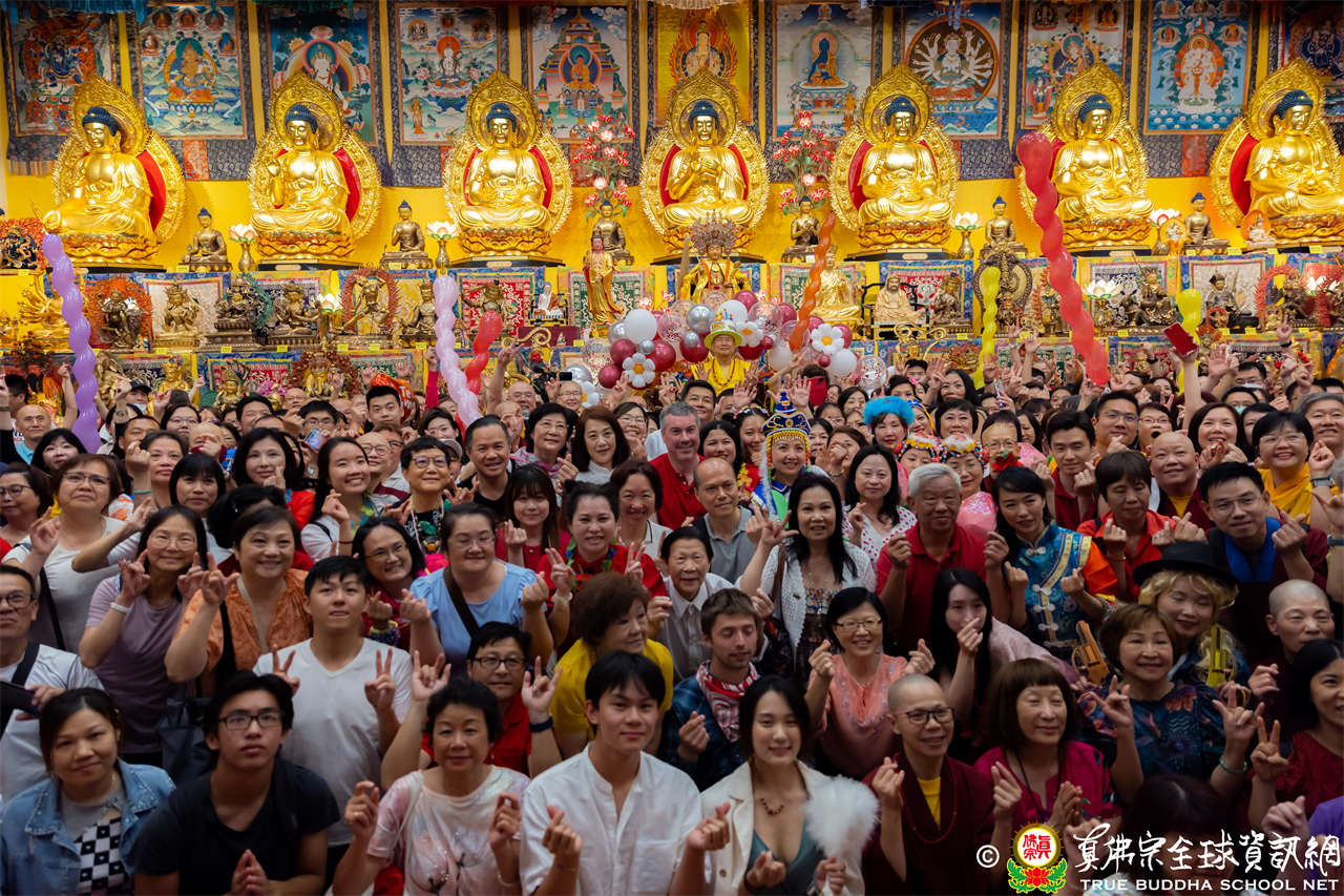 最後邀請師佛偕同師母與四眾弟子在壇城前大合影,壽誕慶祝晚會在弟子們的歡樂笑聲中,圓滿落幕。整場晚會,在主持人蓮訶上師和周慧芳律師二人聯手之下,猶如雙簧表演,二人妙語如珠,節目緊湊沒有冷場,以及別出心裁創意表演,師佛、師母整晚都樂開懷。師佛特別稱讚整場節目都很棒,最後在歡樂的『生日祝福歌』歌聲中,眾人才依依不捨的向師佛、師母道晚安。大家意猶未盡,彼此都情不自禁地相約明年師尊佛誕時,將再臨祖廟向師佛賀壽。