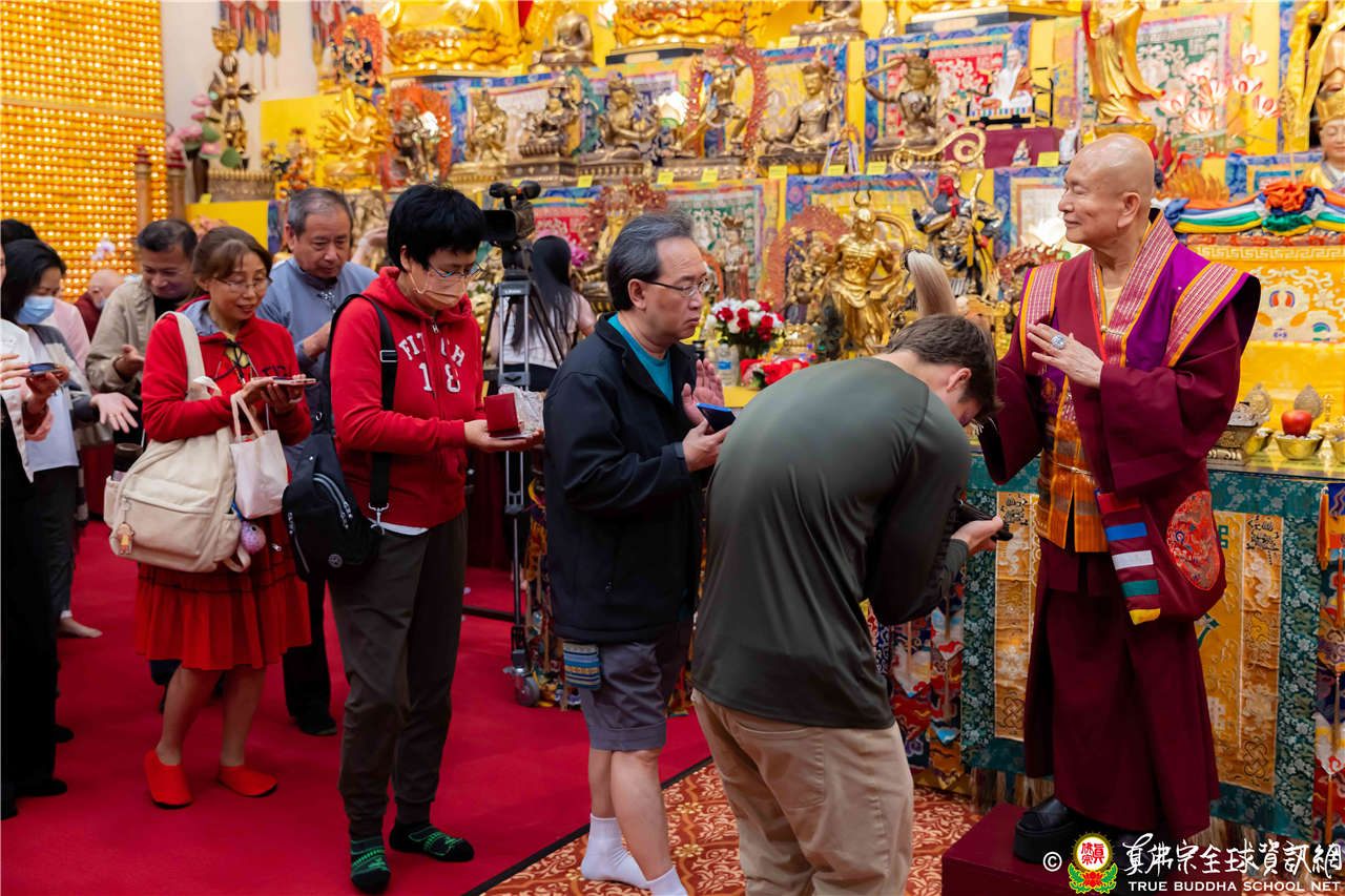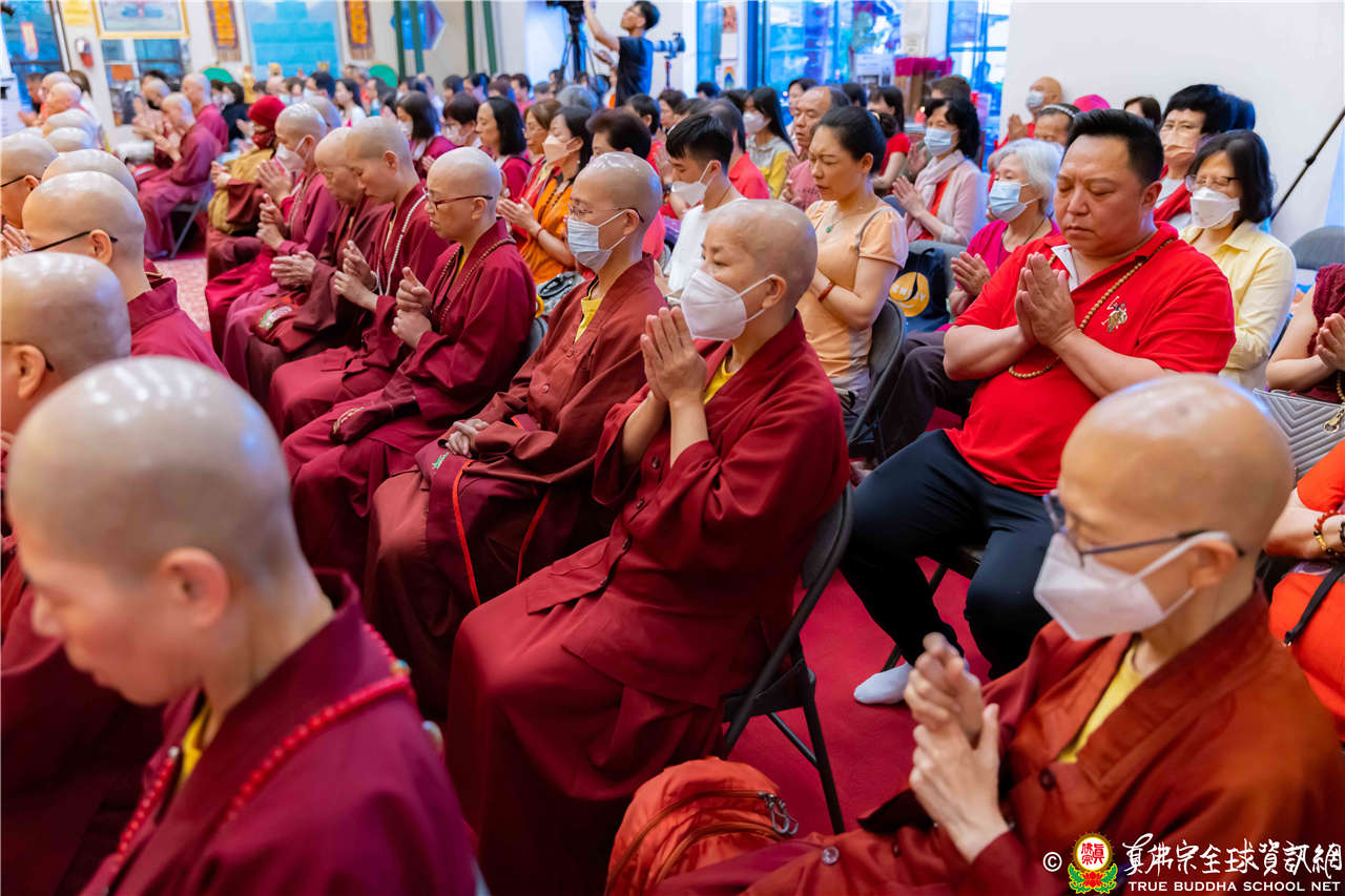 2023年7月22日晚上八時西雅圖雷藏寺大雄寶殿裡人潮匯聚, 來自世界各地及美國各州的四眾弟子,虔誠恭敬的跟隨著聖尊蓮生活佛盧勝彥修持阿彌陀佛本尊法。