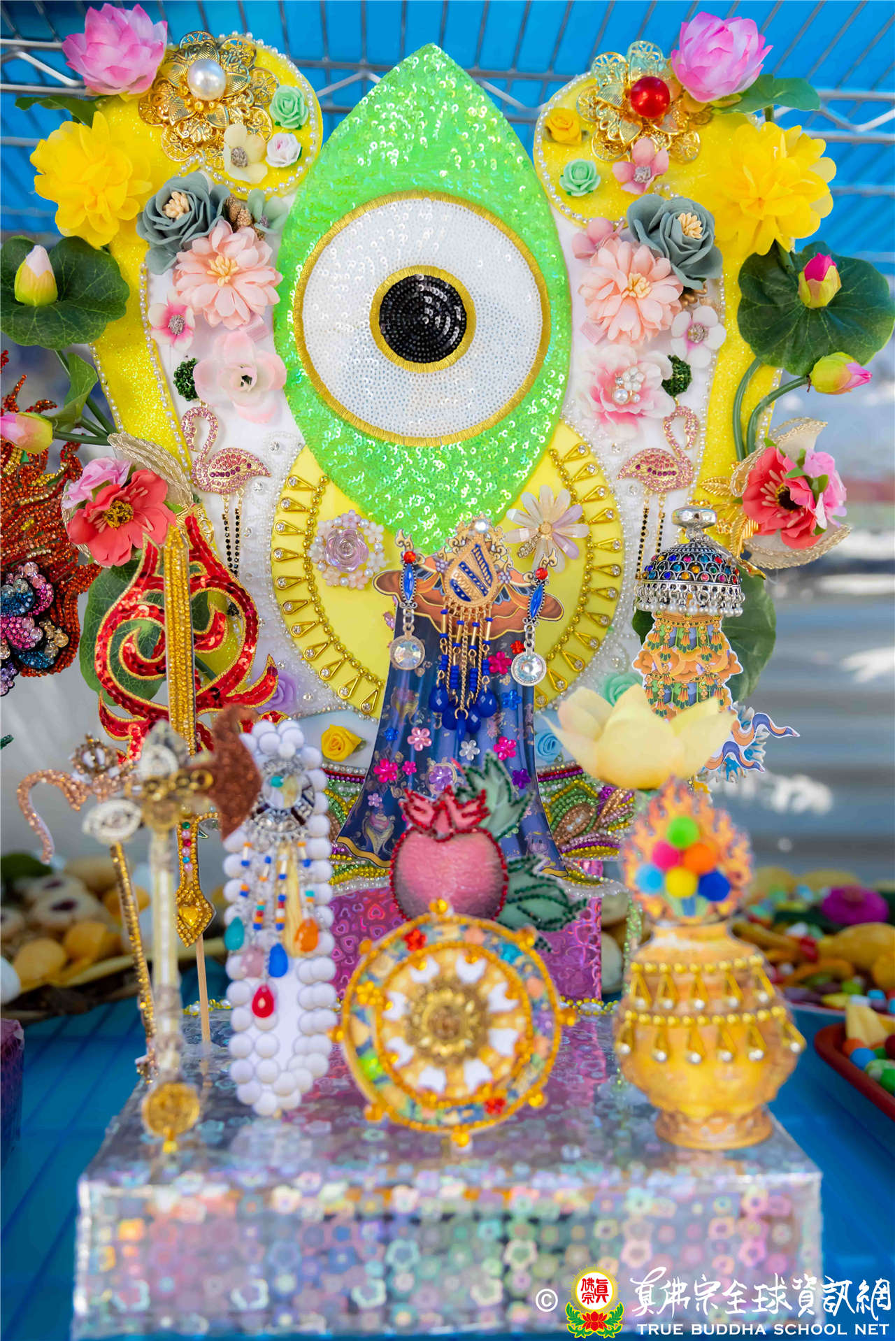 準提佛母有三眼及十八臂,是修第三眼最主要的一尊,中間兩手結的是準提菩薩的根本印。密教裡每次開始結手印的時候,都要結準提佛母手印,也是總持印。祂是法王的上師,也是普方上師的本尊。準提佛母十八手就是十八個法器,等於十八不共法。祂手上有「如意寶幢」、「蓮花」、「罐」、「索」、「輪」、「螺」、「寶瓶」、「般若篋」、「寶幔」、「金剛杵」、「鈎」、「鉞斧」、「天妙果」、「素珠」、「智慧劍」、「施無畏印」,一共有十八手。修準提佛母的法時手上沒有法器,通過觀想所修之法對應的法器放光,就可以修法。