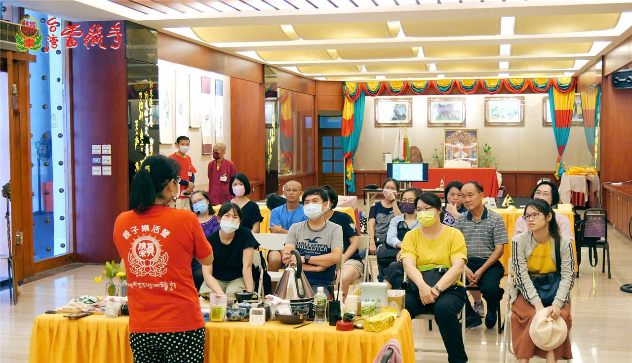 殿外迴廊有著與大殿相對應的大唐卡,還有Q版的花燈小蓮花童子,更有代表密教特色的轉經輪,小朋友依次唸著蓮花童子心咒,轉動經輪..願咒音傳遍十方,為每位小朋友開啓無上善緣。