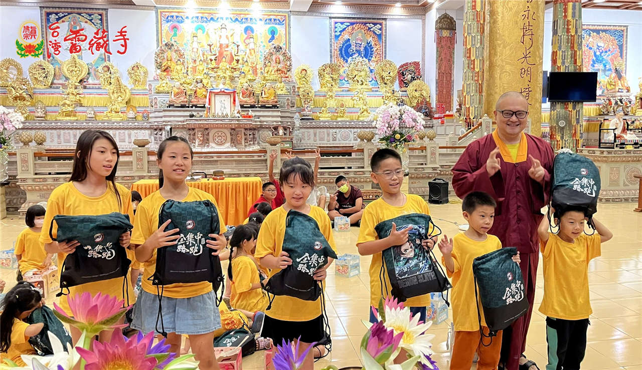 最重要的時刻來臨,營長根據統計數據,一一唱名請得獎的組別領獎。〈中國真佛宗密教總會〉理事長蓮東上師送每位小朋友一個蓮花童子幸福御守。又,一包包的禮物是協辦單位華光功德會的贈與。另外還有葉淑雯教授的愛心餅干盒,蓮江法師從美國帶回的QQ糖,蓮雪法師的鉛筆組。還有點心餐盒,造型氣球...真的是滿載而歸。