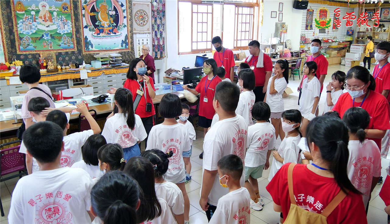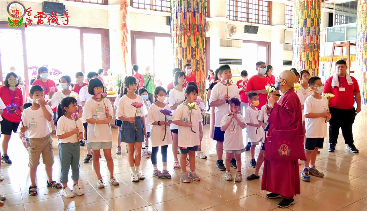 接著由資深老師熊師姐帶領幾位義工同門 ,為所有小朋友及家長對美麗雄偉的雷藏寺做一番簡介~賓頭盧尊者、不動明王、大力金剛、傳承大唐卡、、接著密壇真佛宗的緣起母娘、蓮花童子、古董紅財神、城隍菩薩,此時,貼心的蔡師姐特地由南部買來香水蓮花,送給每位小朋友供養佛菩薩,看著小朋友們天真虔誠的模樣,感覺再辛勞也值得了。