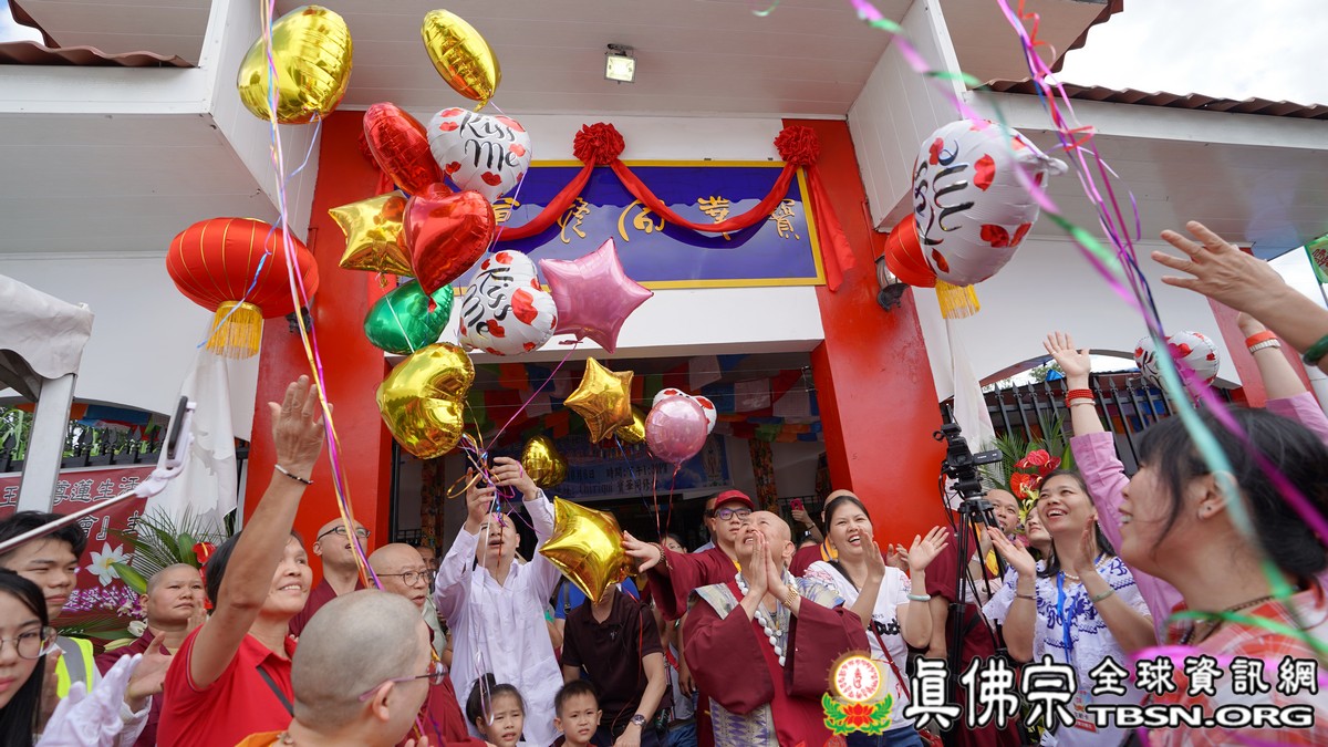 開光儀式當日,艷陽高照,寶華同修會的同門將道場佈置得十分隆重,壇城的中央鋪上長長的紅地毯直到馬路邊,義工同門準備了許多七彩的氣球,和許多的點心、飲料供與會的信眾享用。