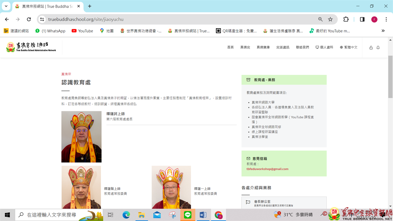 現在教育處各項工作的進展,得到眾多得力幹將的支援與幫助:教育處執行秘書釋蓮茹教授師、行政秘書奕材講師、法學堂負責人細妹講師及大德佛學院團隊、真佛網路大學由奕材講師率領全體輔導員團隊負責、真佛教材編輯團隊由DJ師姐帶領諸多精英、真佛網路大學後台技術支援由顧浩翔教授及荔嚴助教負責、全球網路同修由美娥助教及各位弘法人員帶領。