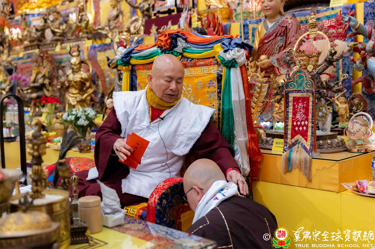 聖尊講解維摩詰經後,為新皈依者做皈依灌頂,加持大悲咒水,並以拂塵一一加持與會大眾。