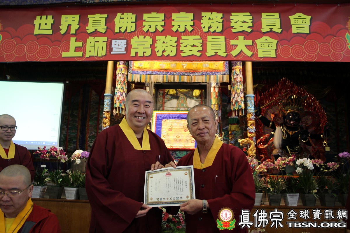 在此次會議中,會長頒發「當選證書」給常務委員,我們祝賀新一屆的宗委會常務委員當選,感謝上師們多年來無私的奉獻與付出,藉著交換禮物,彼此交流與祝福。