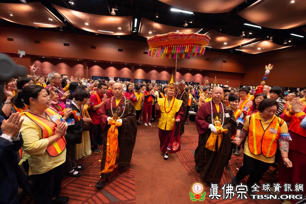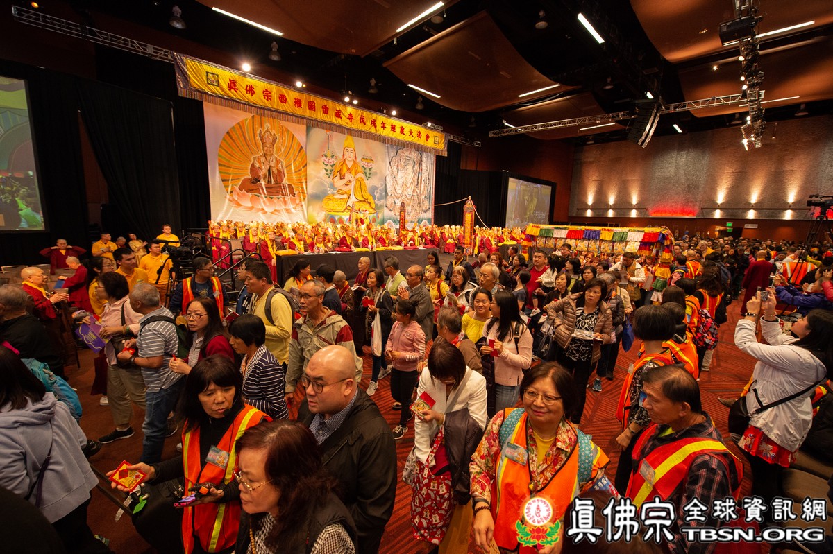 法會當日早上十點半,所有主祈者排著長長的人龍環繞會場,等候敬獻哈達,顯示出真佛弟子敬師重法的誠心。之後,聖尊立即開始為大眾簽書,此時會場播放著宗喀巴祖師與阿彌陀佛的莊嚴咒音。