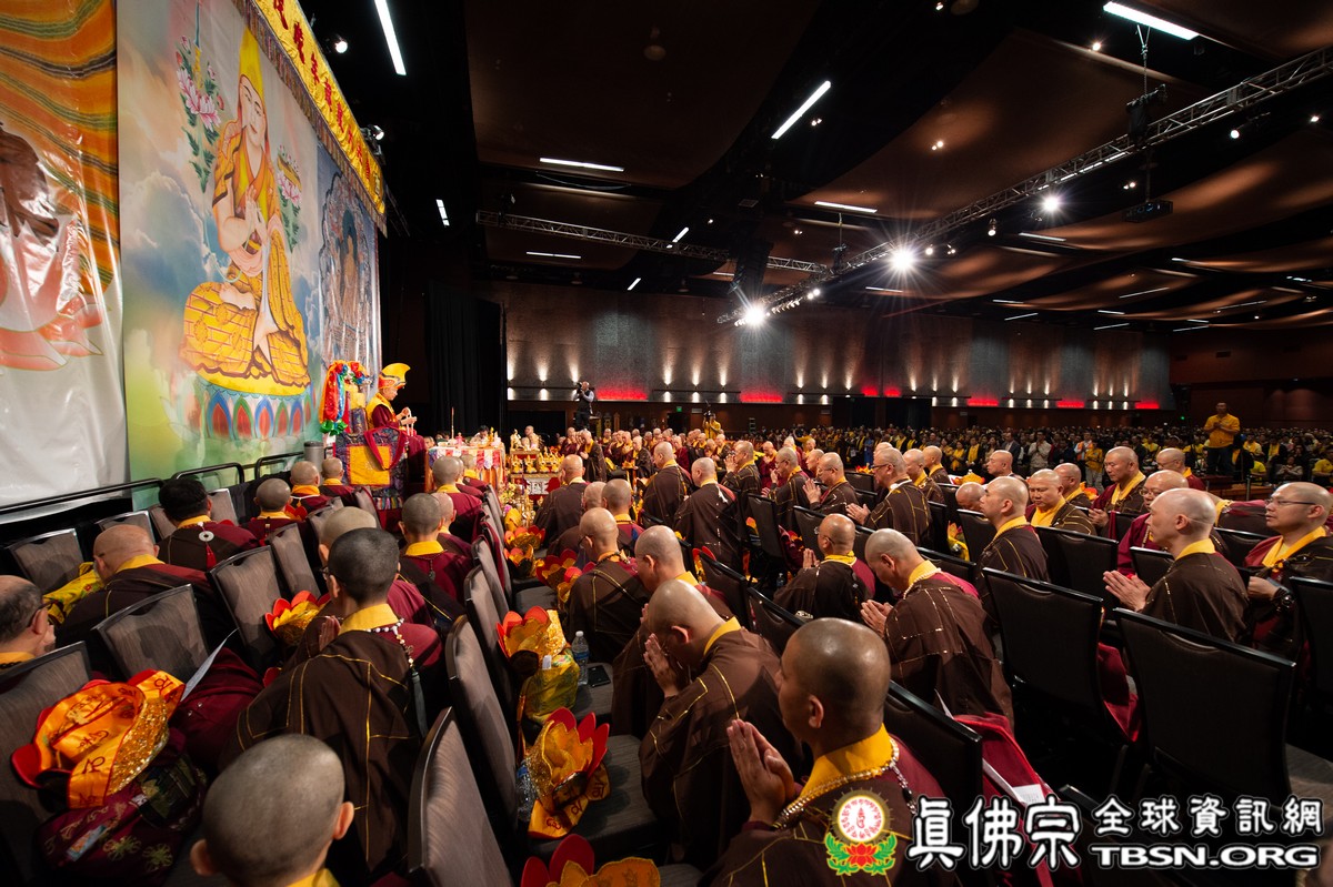 肅穆的法會儀軌圓滿結束後,是大眾殷切期盼的聖尊傳法開示。聖尊一開始提到在法會當中看到阿底峽尊者及宗喀巴尊者降臨法會。在多年前,黃教第一百世的甘丹赤巴法王來到西雅圖,賜給了師尊法王龍袍、灌頂瓶、金剛鈴杵、唸珠、手鼓,甘丹赤巴就是代表了宗喀巴祖師。