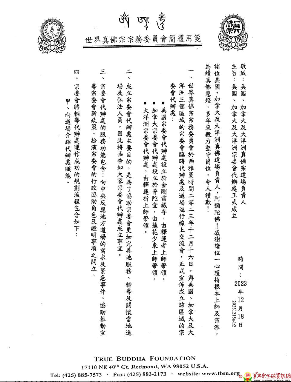 世界真佛宗宗務委員會核心小組與美國、加拿大及大洋洲真佛宗宗委會代辦處共有51位成員,於西雅圖時間2023年12月16日,於ZOOM線上召開首次交流會。本次交流會,主要由督察處處長長老釋蓮僧上師說明宗委會代辦處的功能及責任,以及與各地代辦處互動交流,氣氛溫馨討論熱烈。