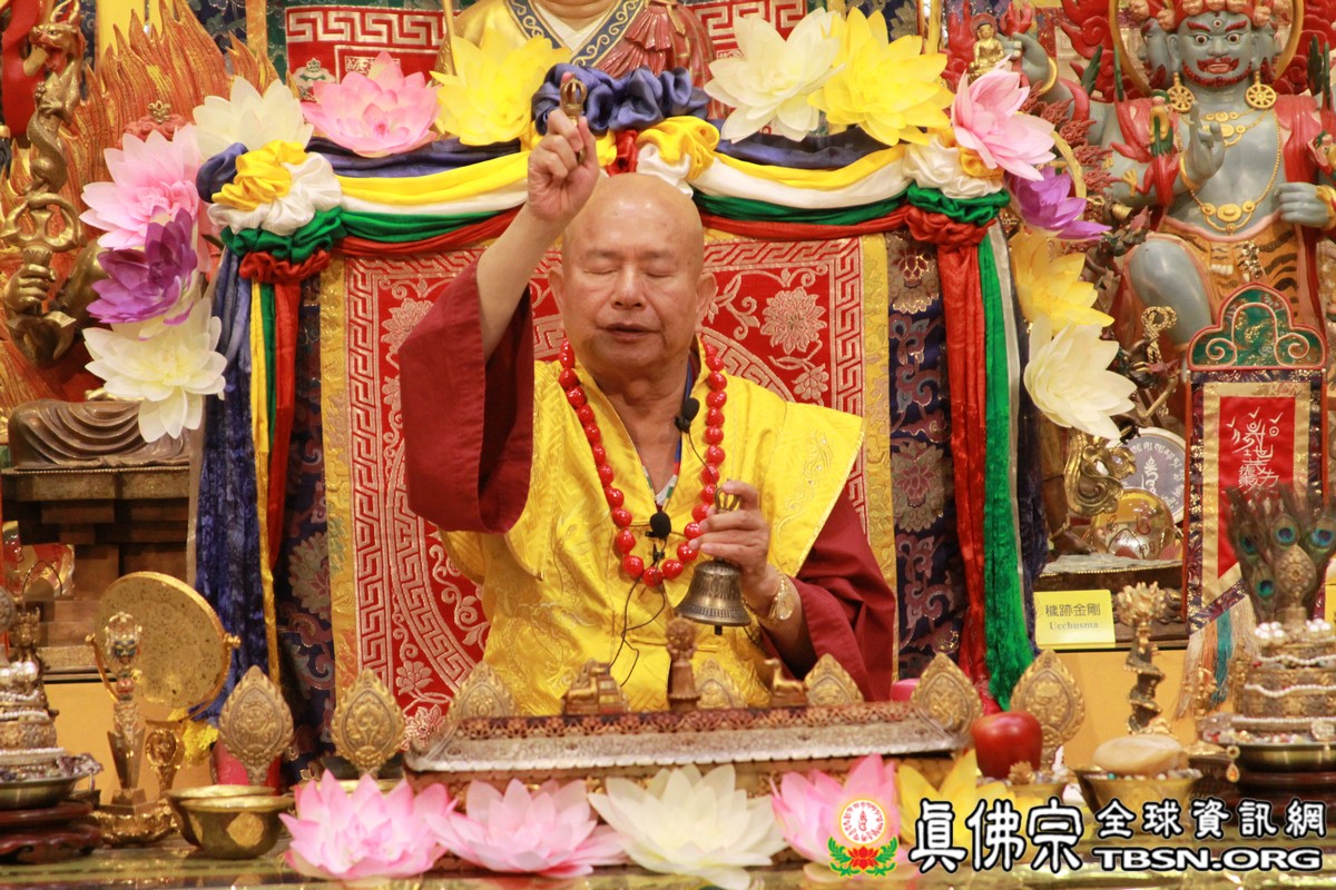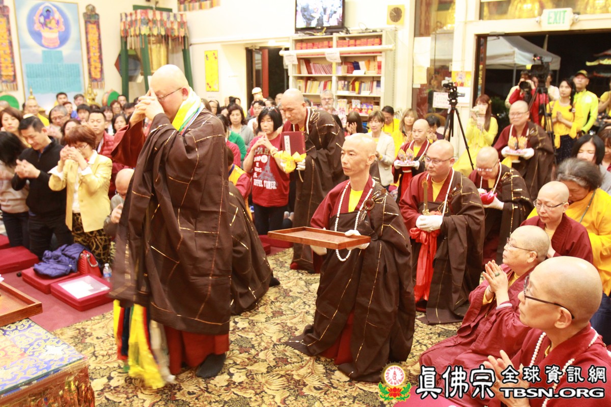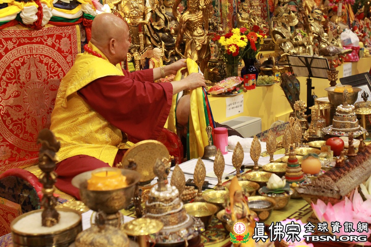 今晚的同修本尊是「黃財神」,同修會修法結束後,西雅圖雷藏寺舉行了隆重莊嚴的宗喀巴祖師唸誦法請法儀式,全體弟子虔誠祈請師尊蓮生活佛轉大法輪,首傳「宗喀巴祖師念誦法」。