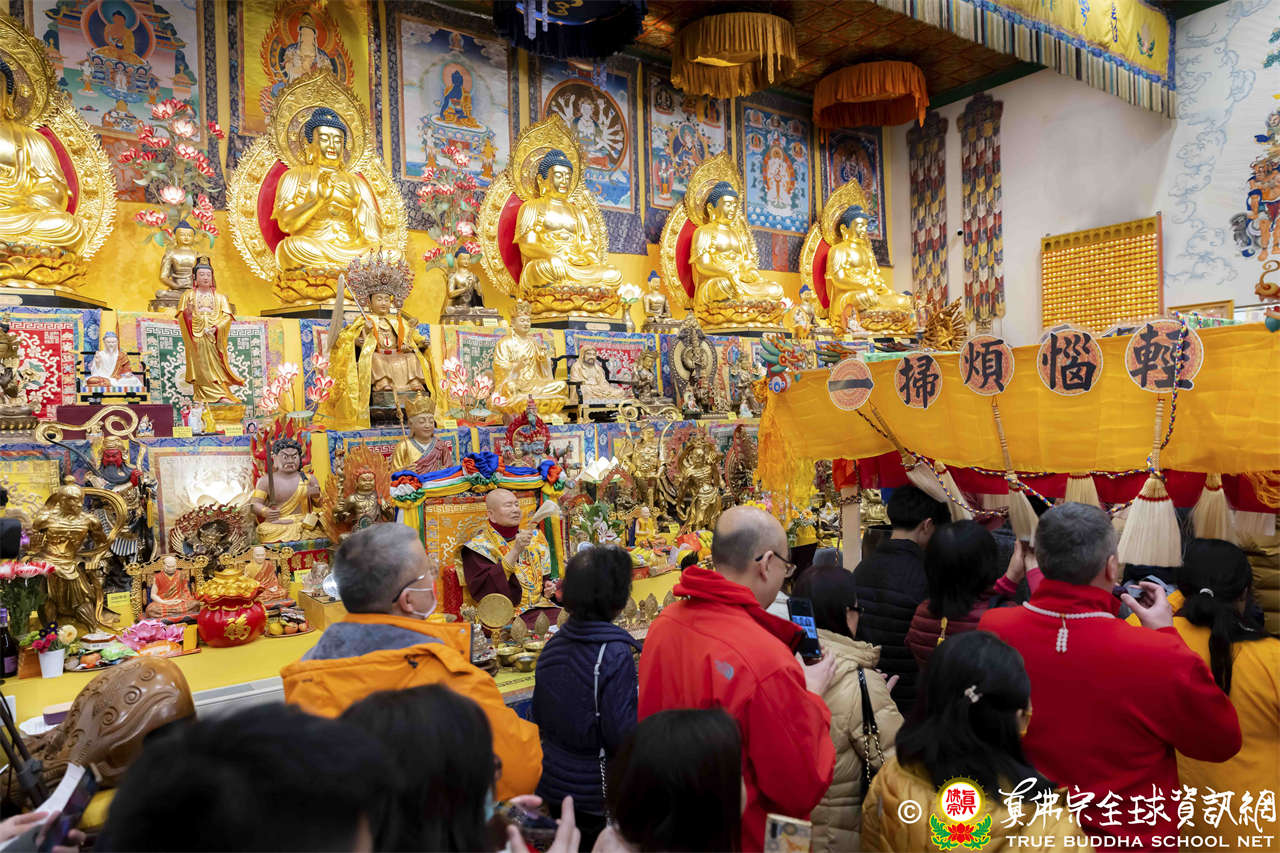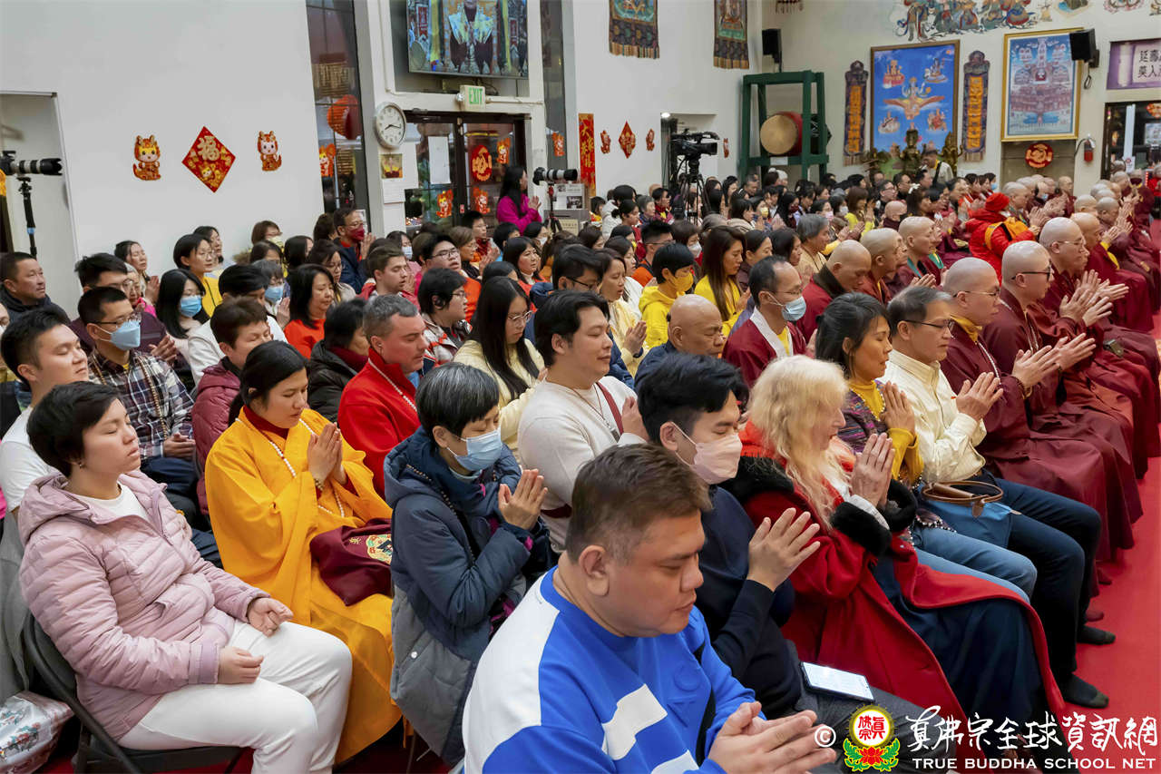 早在除夕之前數個星期,來自世界各地的弘法人員及同門們就不斷湧入西雅圖雷藏寺,滿懷孺慕之情的想和蓮生聖尊盧勝彥、師母一齊歡度除夕及新年。西雅圖雷藏寺張燈結彩,掛滿了喜慶燈籠及各國國旗,並有祝賀詞及吉祥語,希望大眾都有個溫馨難忘的吉祥春節。