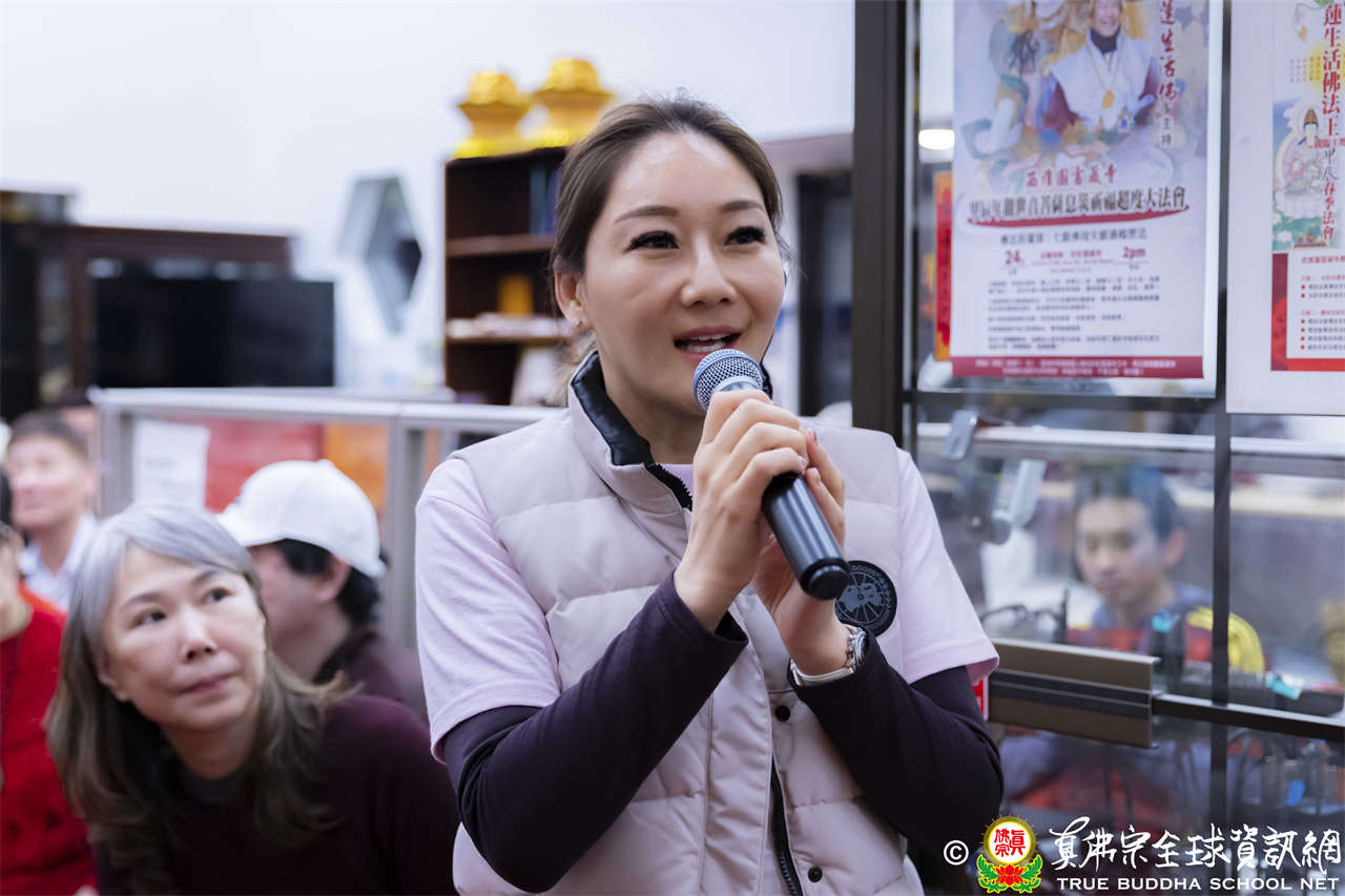 素卿師姐:我和法身之間,還有佛菩薩之間的殊勝感應事跡,寫成修行日記,謝謝師尊賜名五色光女日記。有一天吃午餐前先來禮拜,結果金母的金光發到一半就停止了,我覺得很奇怪,為什麼金母的金光停止了?好像被分心了。然後在我起身看向(寺)門口的時候,才知道是師尊的車開進來了。所以,金母很關注師尊,很愛護師尊。