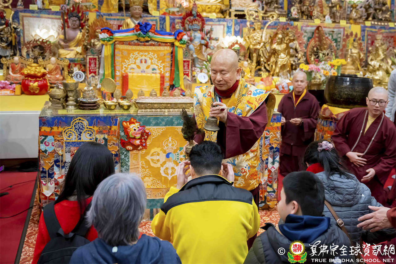 最後,在聖尊手持掃把持續的加持中,四眾弟子陸續走過掃把灌頂幡,洗淨了過去的一切,將迎來未來滿滿的福分,人人歡欣不已,圓滿結束了這場春節同修活動。