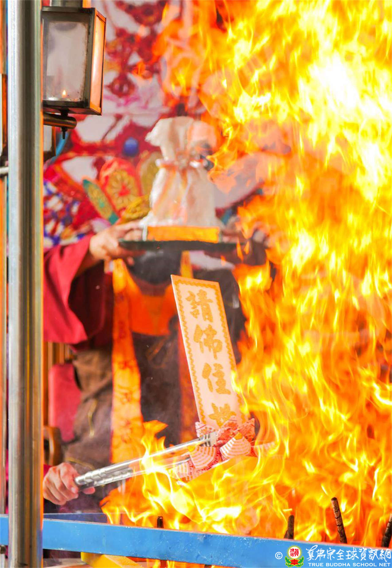 同日2月18日下午兩點,是印尼雷藏寺的新春祈福法會。由青年班的迎師組揭開法會序幕,恭迎釋蓮飛上師入道場,主壇佛頂尊勝佛母護摩法會,暨安太歲儀式。釋蓮飛上師到了壇城前,上香後即加持太歲殿及所有光明燈,平安油燈。此次佛頂尊勝佛母法會前一個多月,由釋蓮轟教授師發起眾同門合作持誦尊勝陀羅尼咒十萬遍,功德迴向印尼雷藏寺遠離地水火風等天災。同門都非常努力精進持咒迴向,不到一個月就超過了十萬遍。法會非常殊勝圓滿,上師開示時,特別由蓮轟教授師頒發獎品給三位持咒最多的同門,上師也稱讚蓮轟教授師的發心及努力,印尼雷藏寺近些年常遭水患淹水,尊勝陀羅尼咒的威力果然使印尼雷藏寺平平安安,沒再遭水淹。