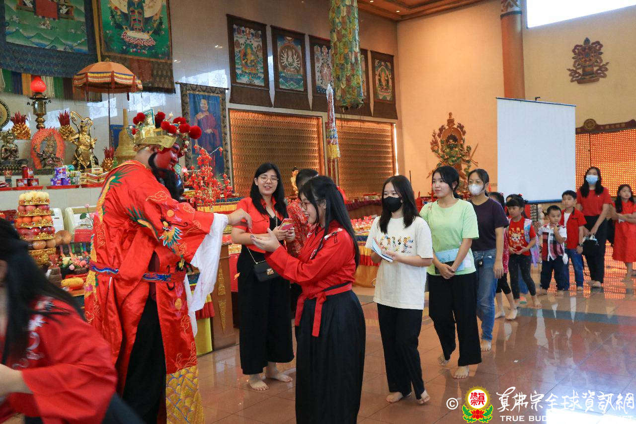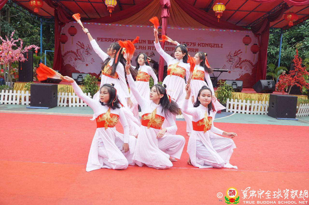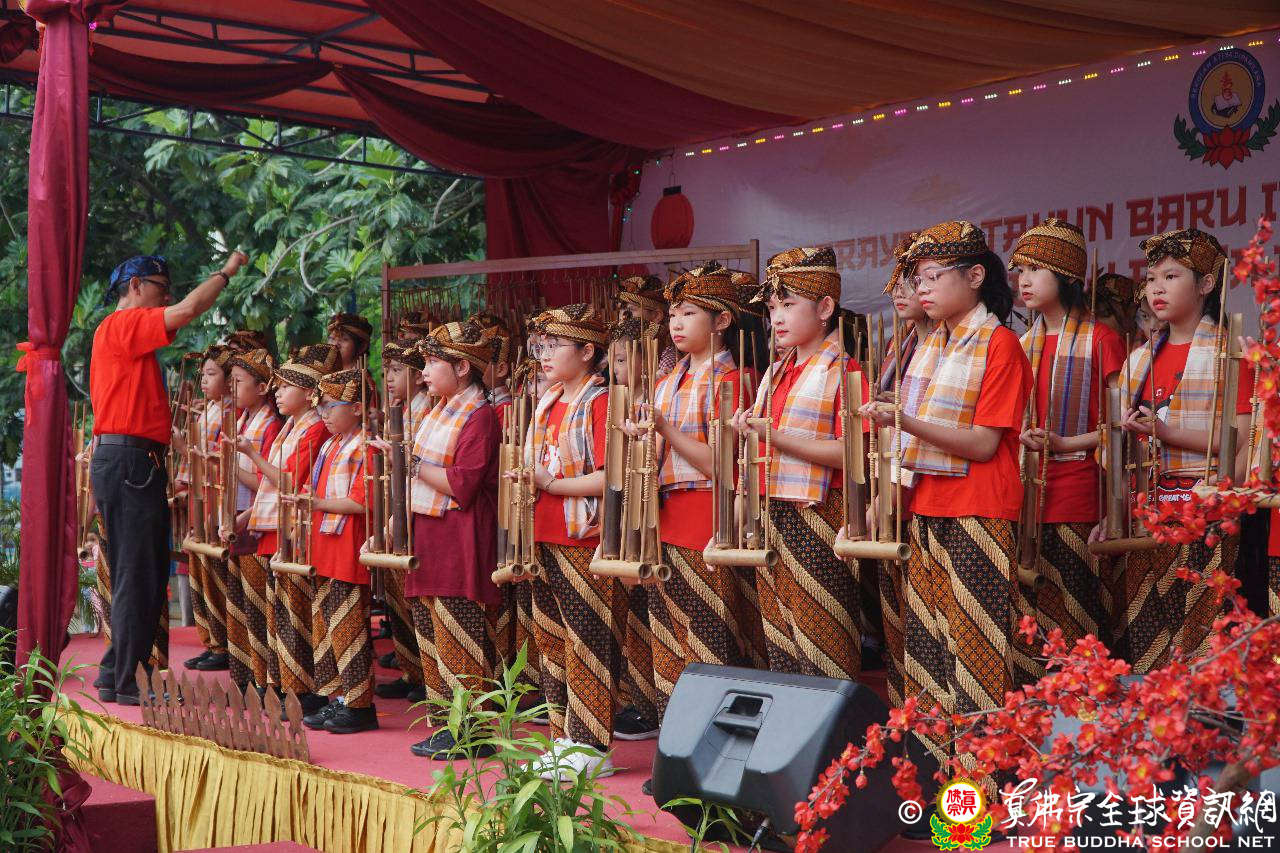 印尼雷藏寺佛學班的全體師生則在2月18日星期日上午9點,假座雷藏寺大殿慶祝農曆新年。首先恭請釋蓮飛上師主壇,全體師生及家長的同修,完後蓮飛上師特別開示為何要安太歲的意義及重要性。接著與會貴賓當格浪縣的佛教輔導司長SAKIYO先生也出來致詞,他特別囑咐要教導孩子們尊敬父母親。然後就是學生們的才藝表演,有玩扯鈴的,舞蹈表演,話劇表演等,還有搶答問題得紅包的,最後是財神爺出現大發紅包。那些陪伴孩子們來參加節目的家長們,幾乎都穿上紅色的服裝,讓現場一片喜氣洋洋。