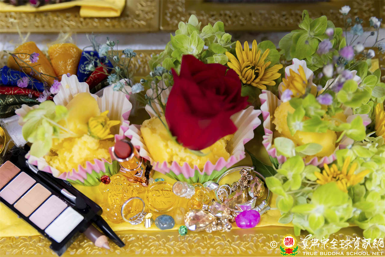 法王表示供養聖觀音的珍寶包含七珍八寶,寓意七珍八寶花不完;五穀,寓意五穀雜糧吃不完;五色綢布,代表漂亮衣服穿不完。修此法,必得財富,前提是懂得布施。如果無法做財布施,也可做法佈施,將自己所懂的佛學知識教會他人。佛教中,以法施為上。而且,布施應不求回報,福報冥自有安排。能夠成就佛菩薩,就是最大的富豪。