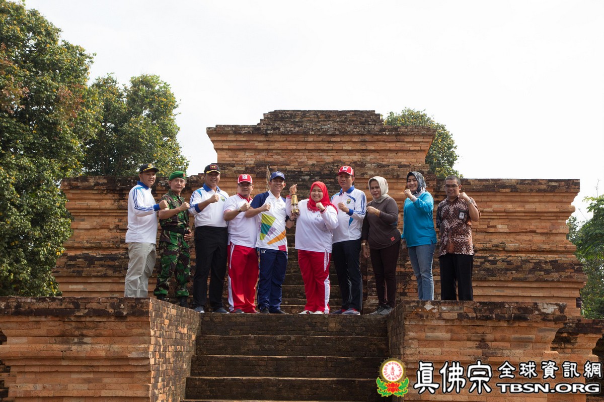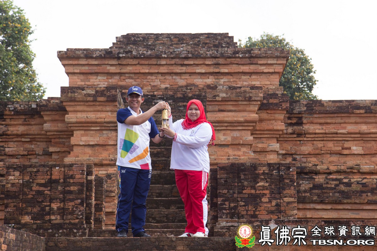 上午九時,迎賓舞及傳統音樂揭開了序幕,亞運主辦單位抵達會場,在占碑古蹟入口牌坊處,將象徵聖火的燈炬,交棒給占碑副縣長 Bambang Bayu Suseno, SP. MM. M. Si,副縣長代表接受後,前行至古蹟區內最大的聖塔,再由縣長Hj. Masnah Busyro, SE正式接下聖火,並與當地政要合影,且致詞祝福此次2018年亞運在印尼能成功圓滿的舉辦。接著,更接受來自世界各地約40個媒體的聯訪,此次亞運是印尼自1962年後,睽違超過半世紀後再次舉辦的盛會。