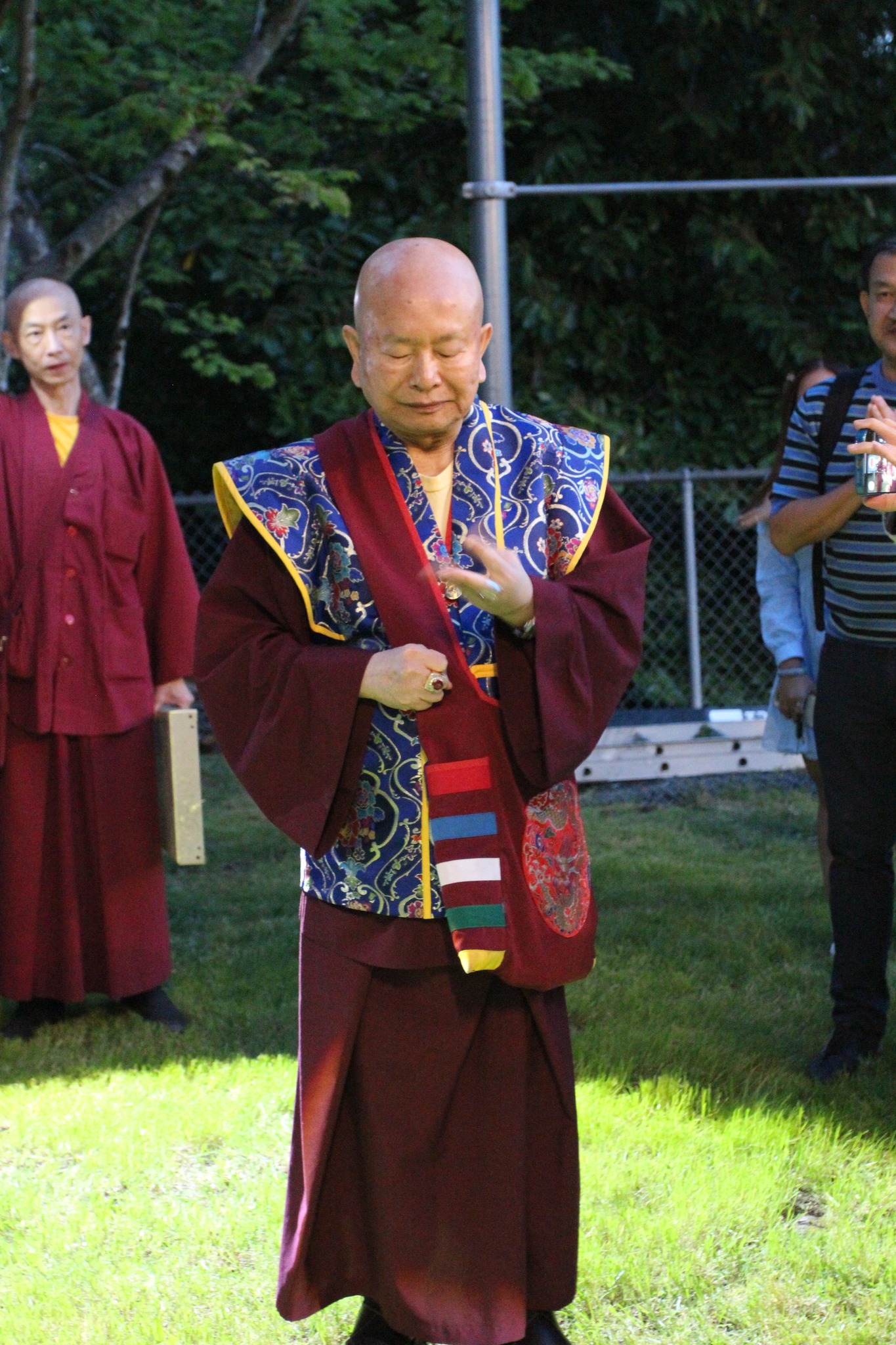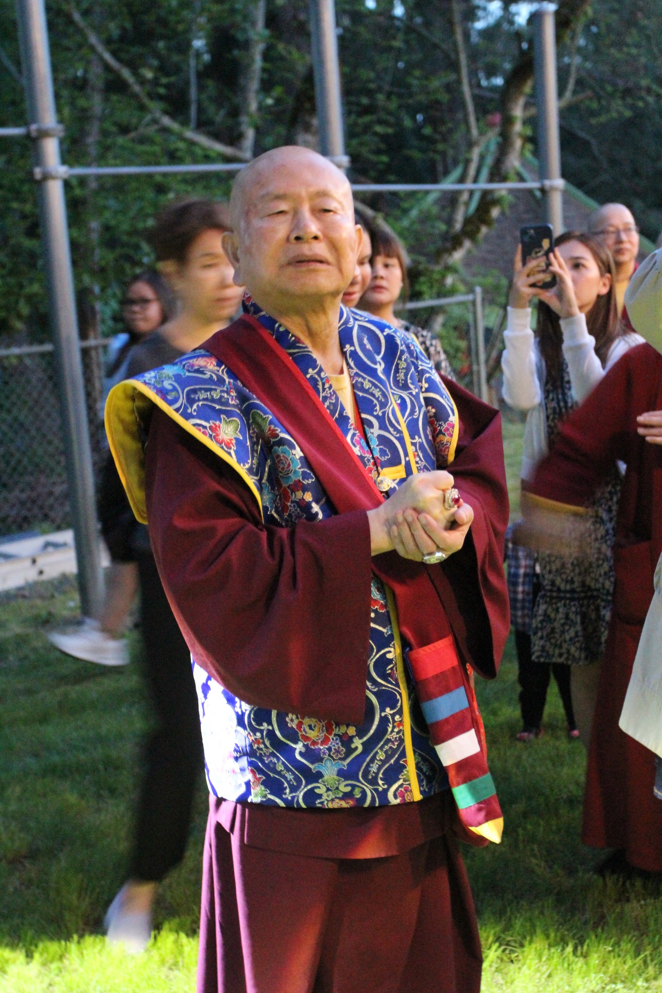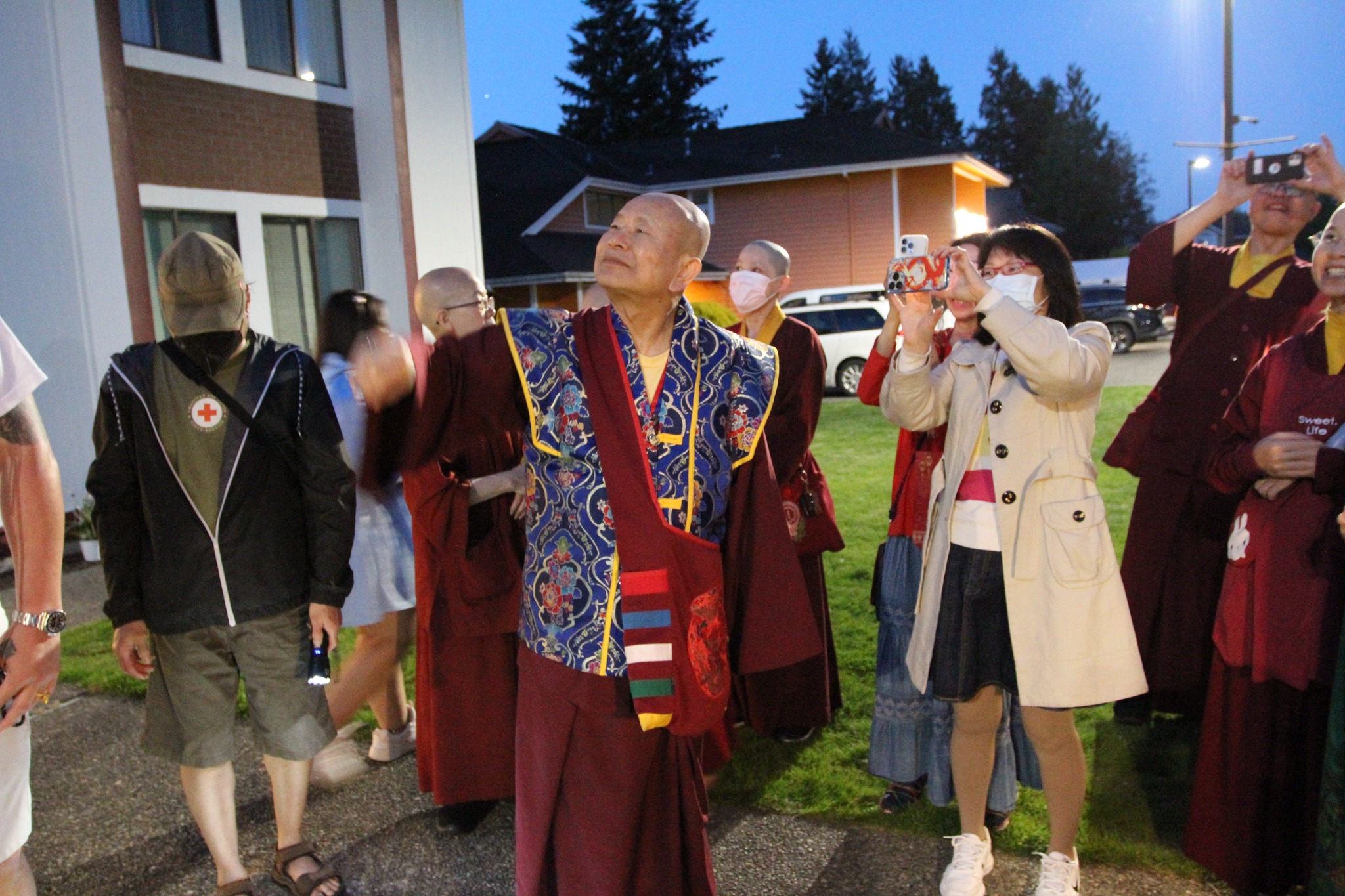 堪輿結束後,師尊回到真佛密苑,在門口與大家談話時,突然問起月亮在哪裡?眾人紛紛仰望夜空找尋,只見明亮的下弦月正好掛在剛剛師尊所點的月下老人祠處的上空,眾人驚訝不已,直呼相應了!師尊說,真的是月下老人耶!將來想求婚姻的都可以來求月下老人,得到紅線有個好姻緣。