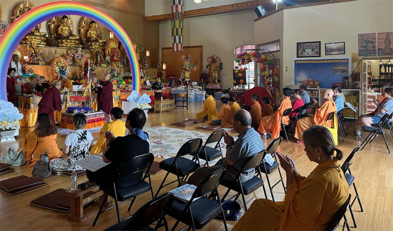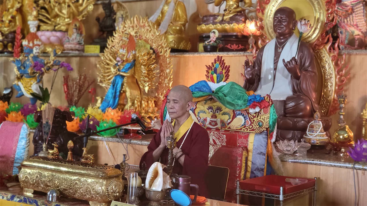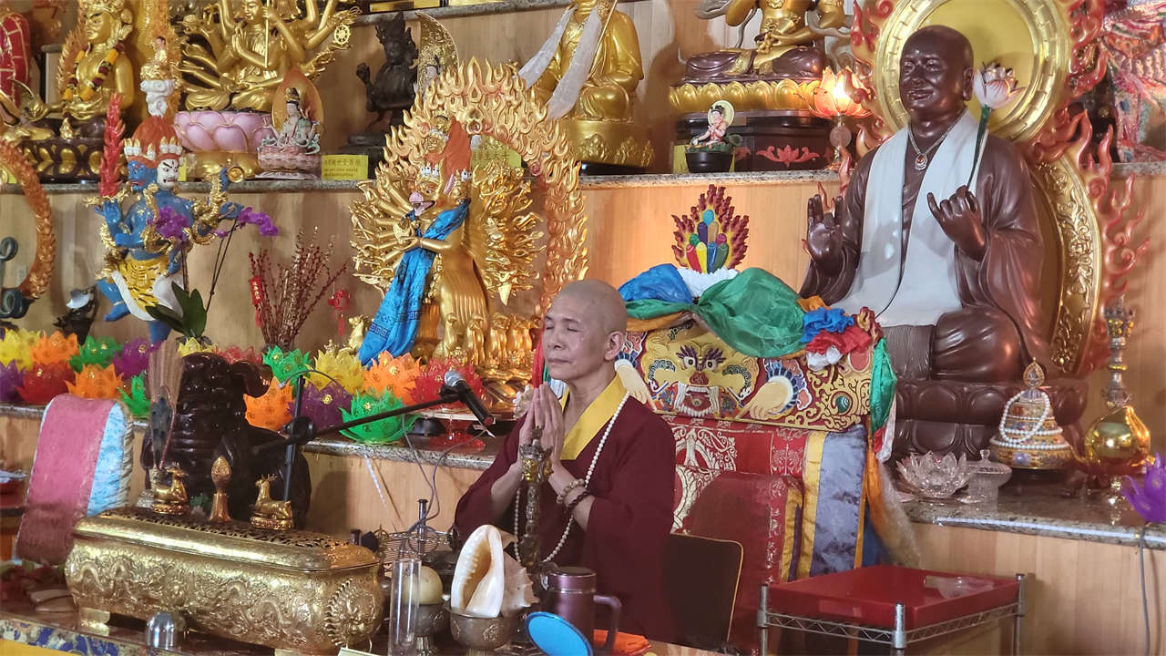 釋蓮央金剛上師於2024年5月19日在美國達拉斯三輪雷藏寺主壇專壇「請佛住世瑤池金母水供」,迴向師佛: