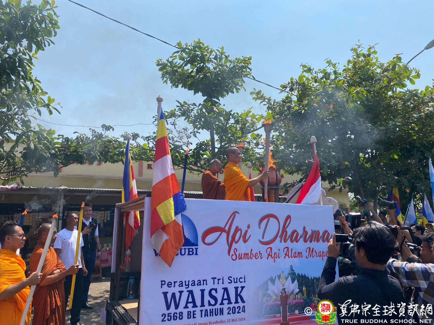 今年2024年的衛塞節慶祝活動,在5月21日迎取聖火儀式中拉開序幕。印尼佛教徒代表大會WALUBI屬下的各教派比丘僧眾,各級弘法人員信眾,從早上六點半就啟程前往婆羅浮屠附近的Mrapen天然火取火聖地,其中包括了數日前從三寶壟徒步經行到婆羅浮屠的Thudong小乘比丘們。取聖火儀式在上午十點正式展開,首先是點燃五色蠟燭,然後是各教派輪流上前祈禱。真佛宗由Suyamto講師、Waliyono講師、Tri Wahyu Widodo助教帶領來自中爪哇的眾同門作祈禱儀式。