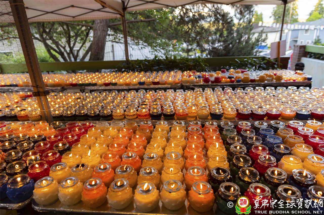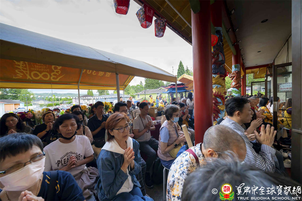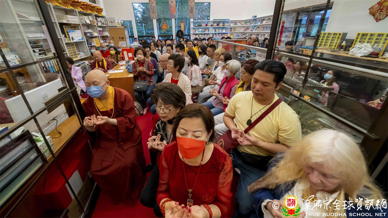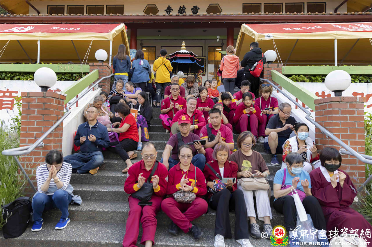 聖尊八十壽誕之際,適逢著作跨越三百本的殊勝里程碑,在這雙喜大慶意義非凡的日子裡,祖廟張燈結彩、喜氣洋洋。熱情的弟子們由世界各地遠道而來,齊聚於西雅圖雷藏寺參與今晚共修,大殿外佈滿了彩色氣球、布條,殿內則有壽桃、壽麵、鮮花,琳瑯滿目的供品堆滿了整個壇城。