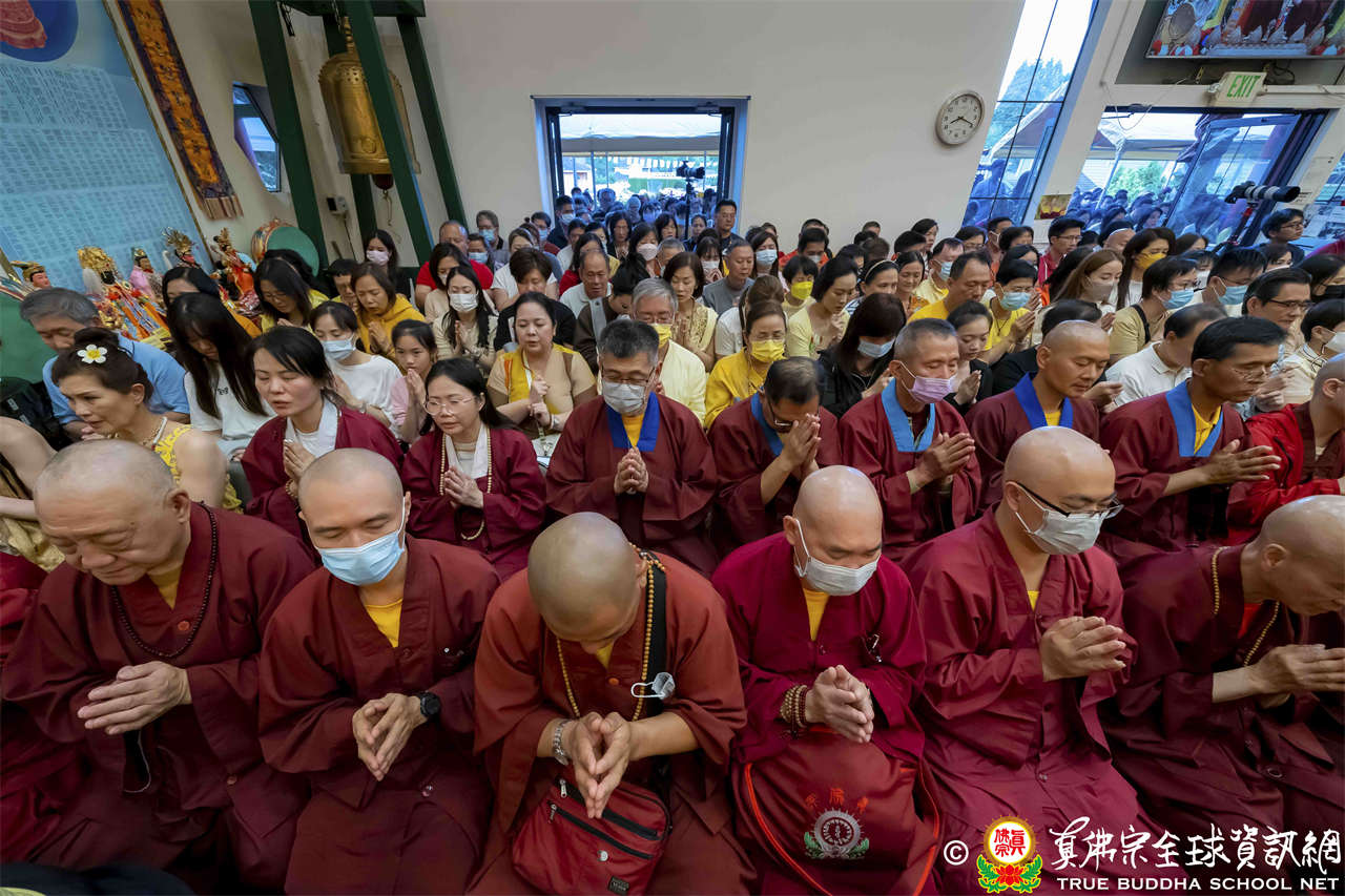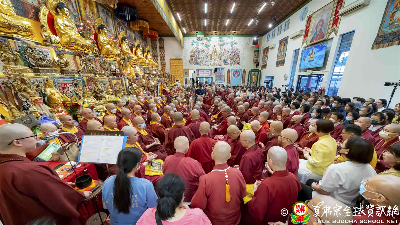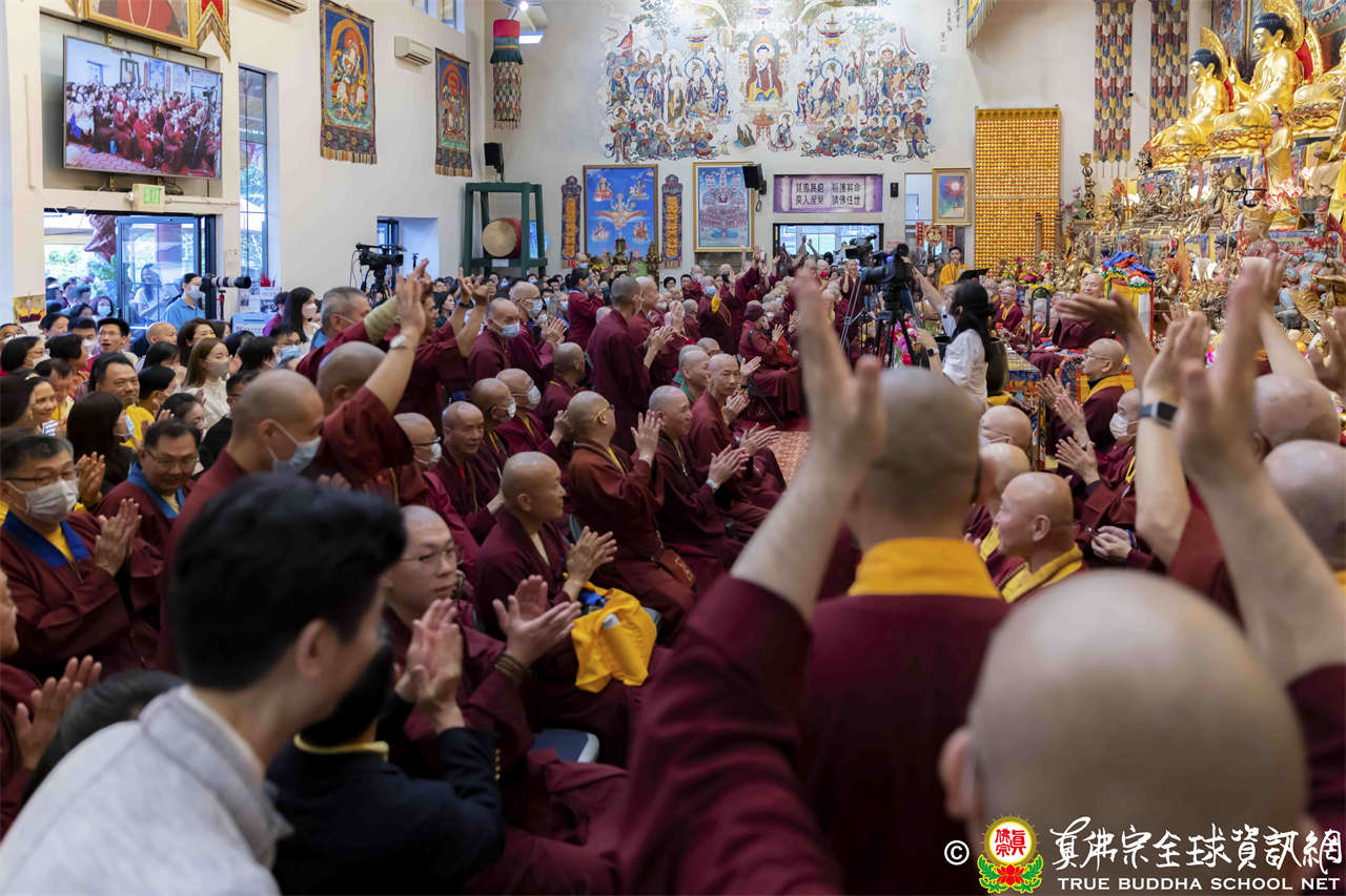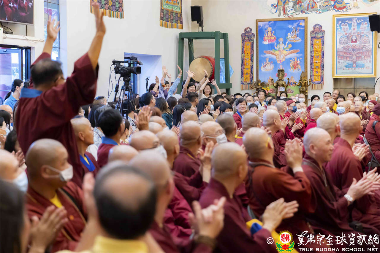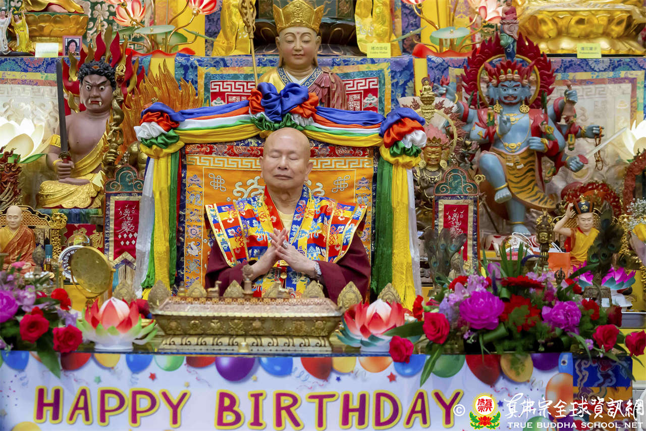 在莊嚴肅穆的共修後,聖尊首先於開示中感謝為了慶生會特別從世界各地來的弟子們。