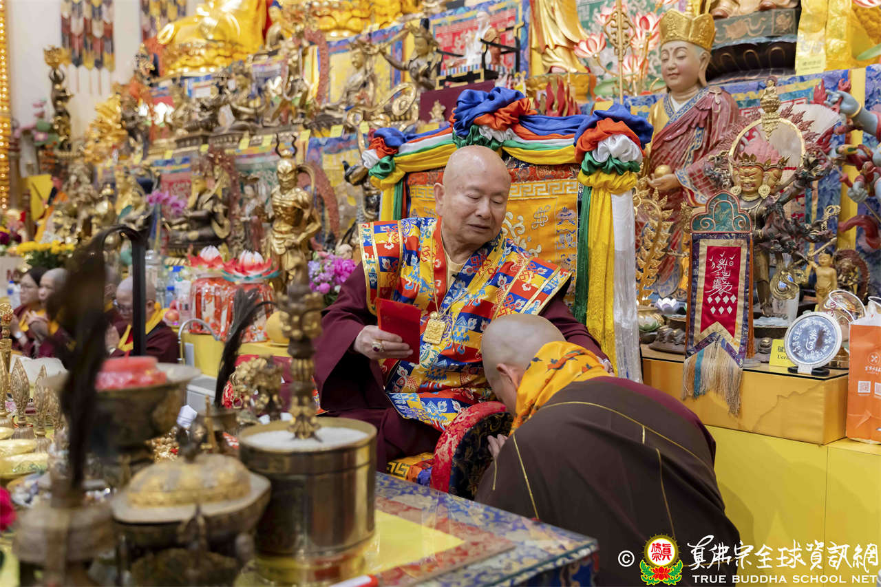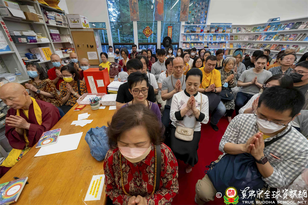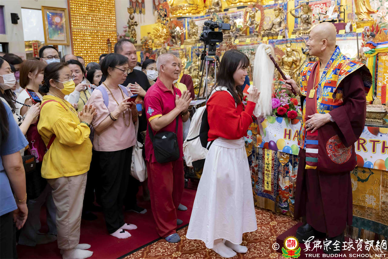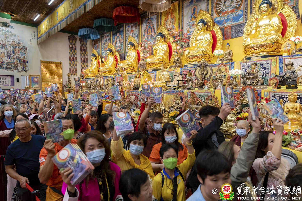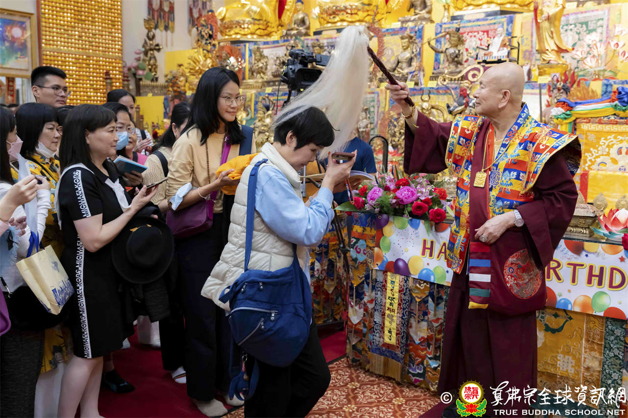 在拂塵賜福加持後,師尊不辭辛勞地為大眾簽書,大殿內外擠滿排隊人潮,最後每個人都得到師尊珍貴的簽名與壽桃、紅龜粿,幸福滿載盡興而歸。感恩根本上師倒裝下生辛勤的救度眾生!師佛所傳授的真佛密法其珍貴性是無法用世間任何寶物來換取的,弟子們誠心祈願師佛佛體安康、請佛住世、長壽自在、利樂人天。