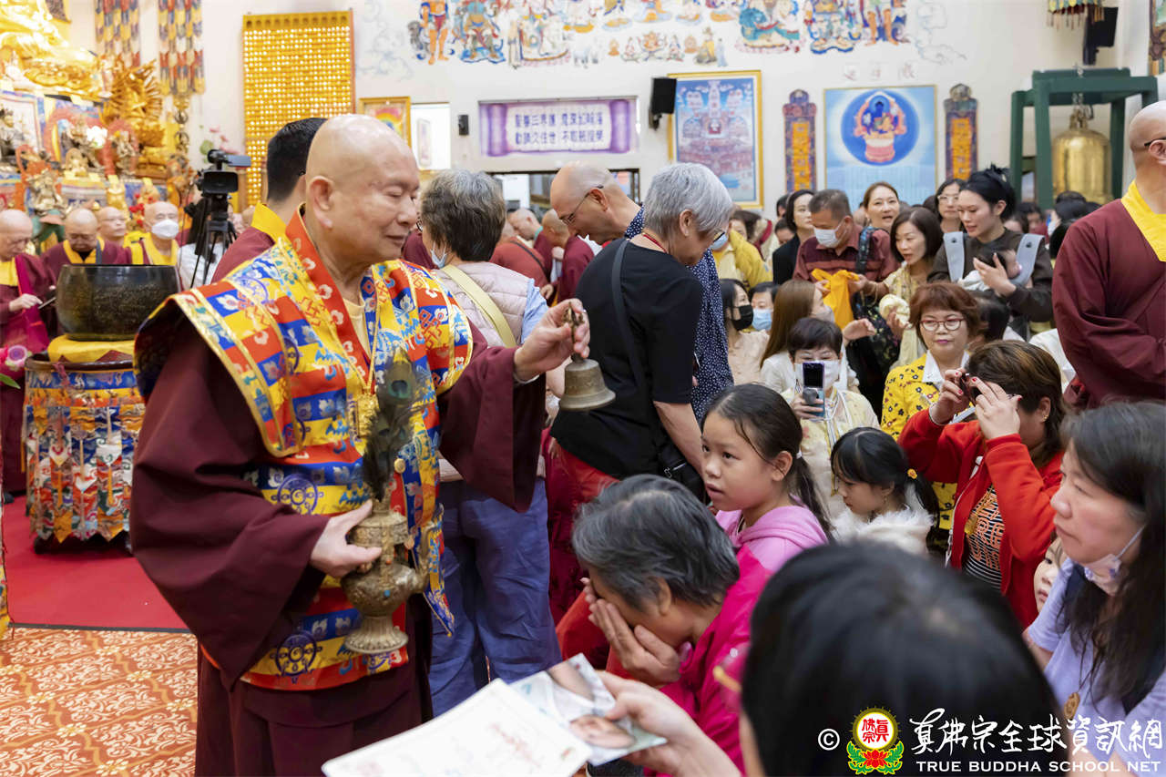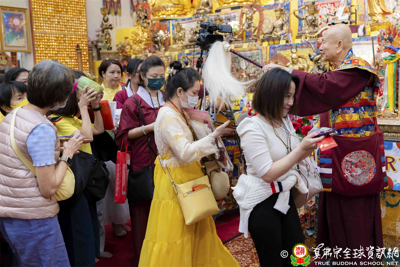 師尊講解維摩詰經後,為求皈依的信眾賜授灌頂,加持大悲咒水、開光佛像,並以拂塵一一加持與會大眾。