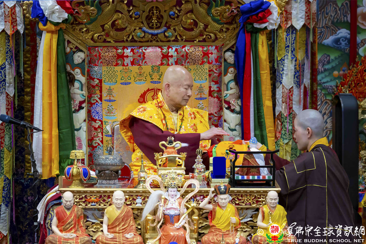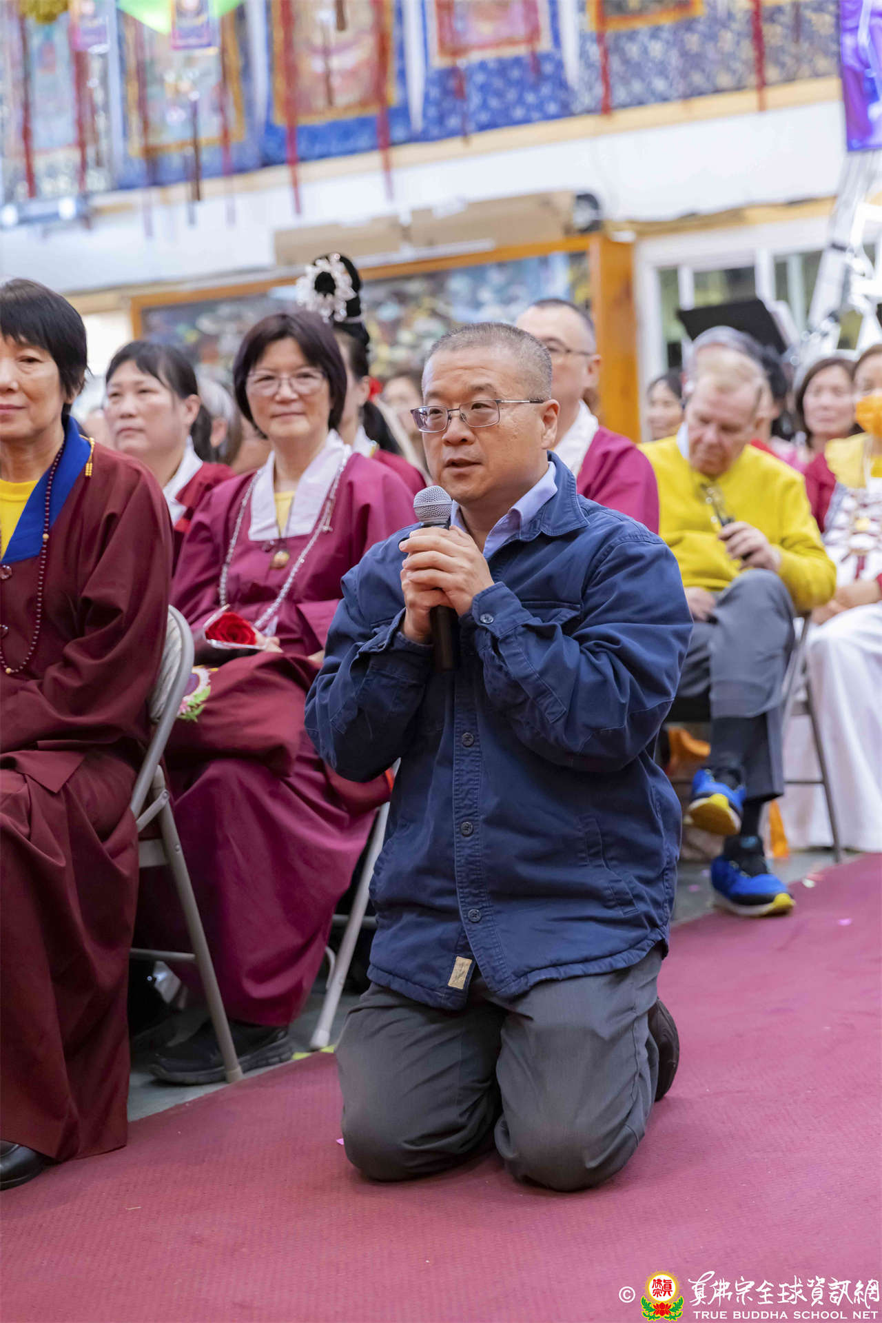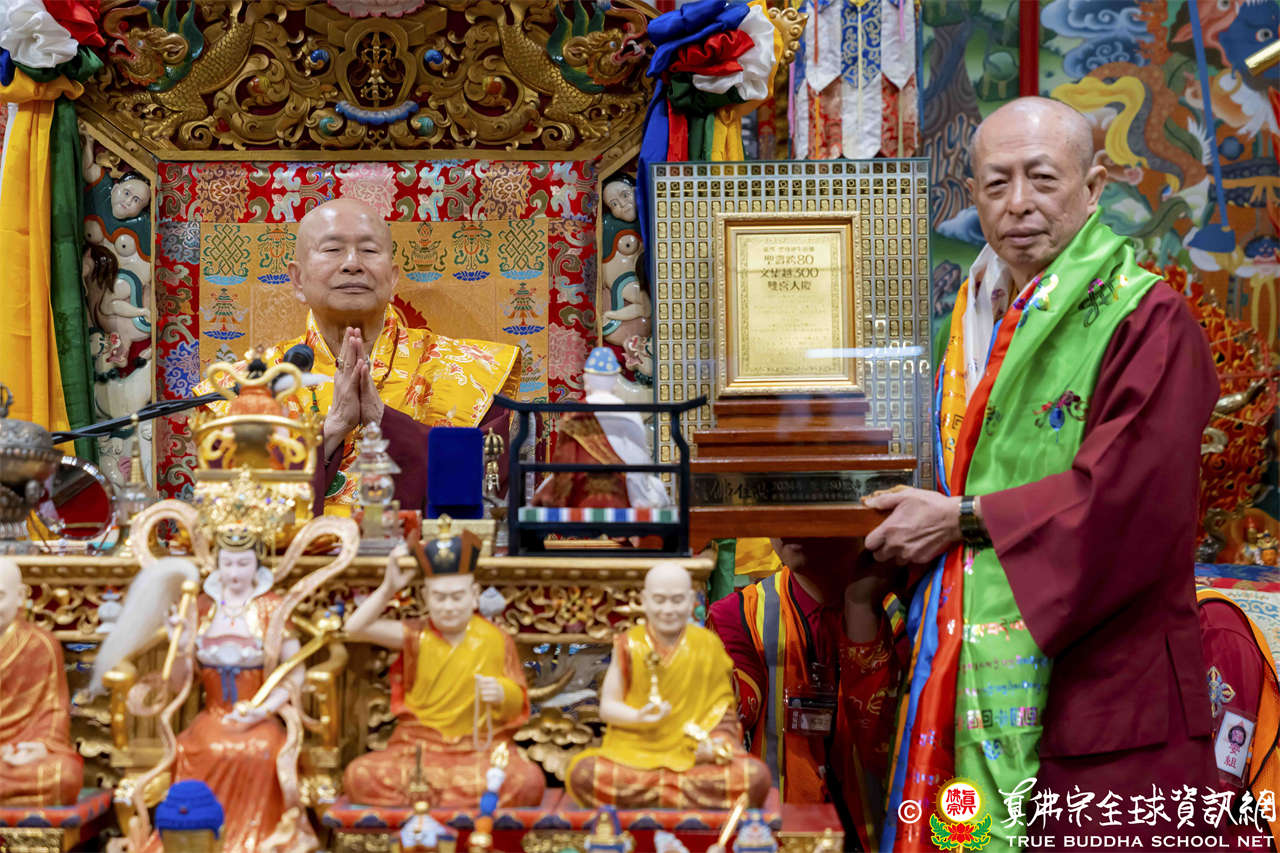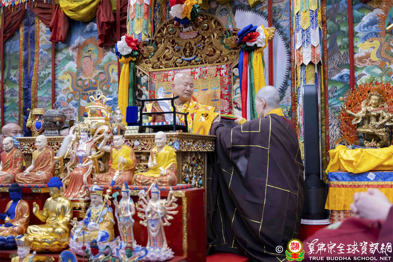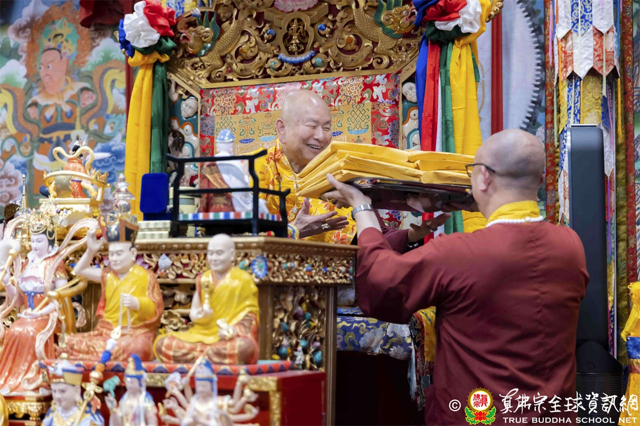 接著請世界真佛宗宗務委員會長蓮花程祖上師、處長們及彩虹雷藏寺住持蓮彥上師、西雅圖雷藏寺代表碧珍上師、台灣雷藏寺住持蓮哲上師出列,頂禮根本上師及壇城三寶,並由會長蓮花程祖上師,代表全球真佛弟子,敬獻賀禮供養真佛宗創辦人無上法王聖尊蓮生活佛。