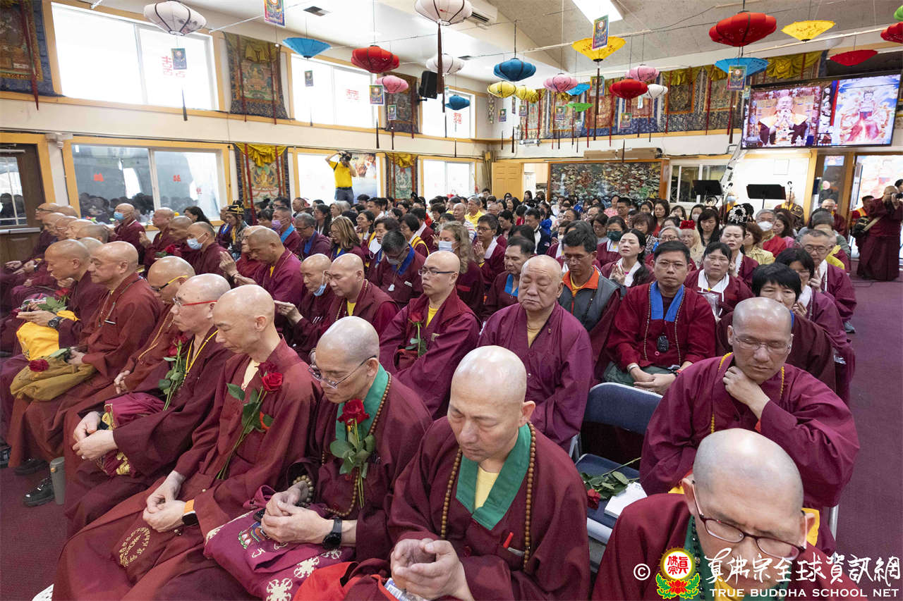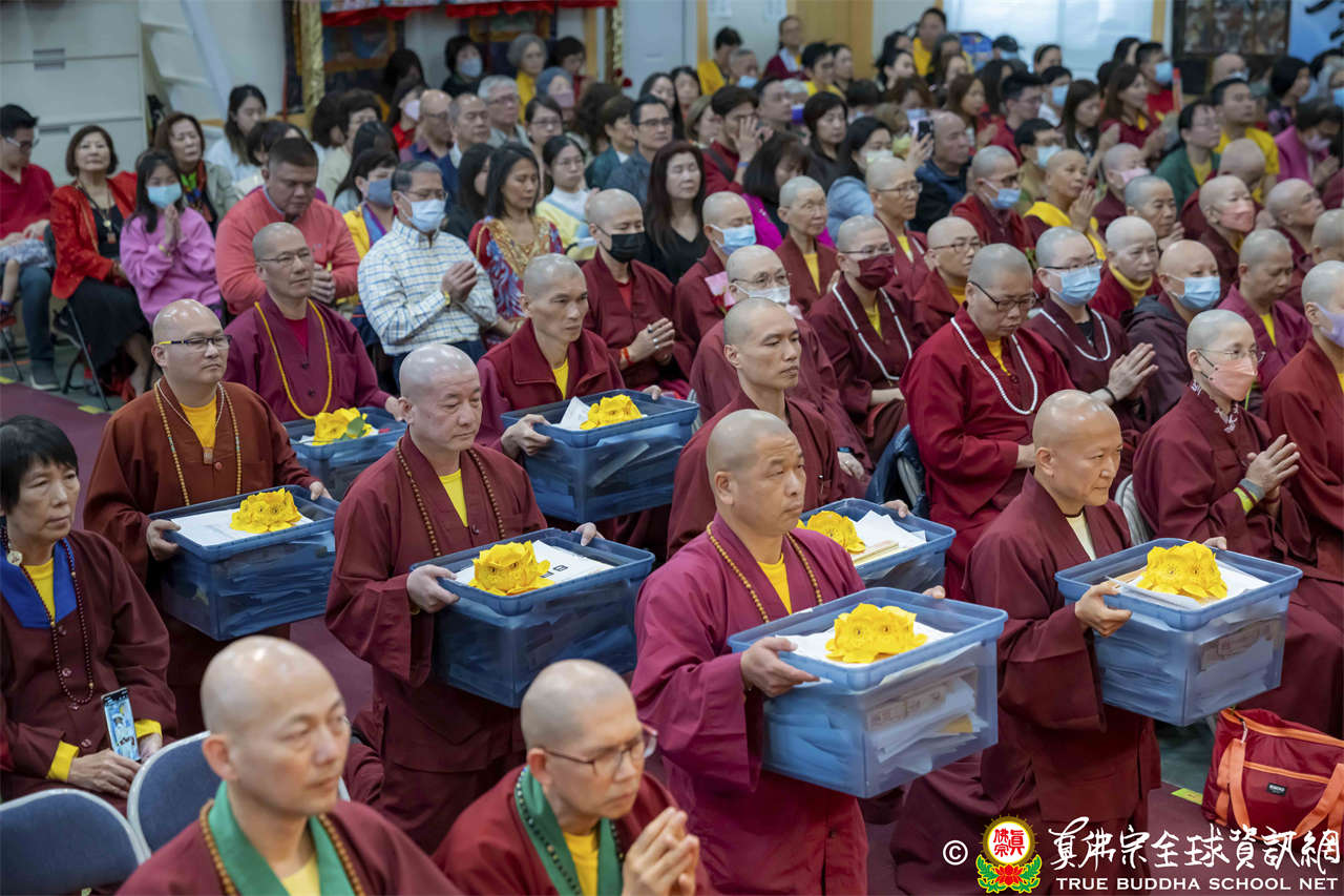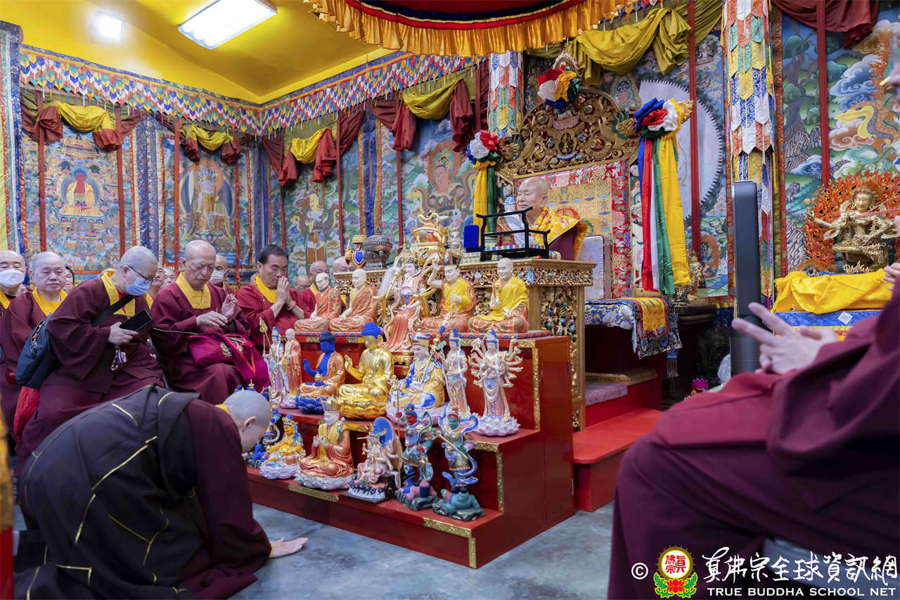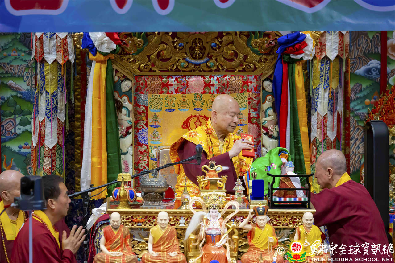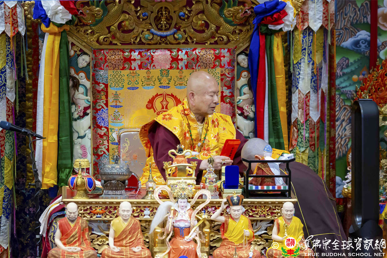 接著請世界真佛宗宗務委員會長蓮花程祖上師、處長們及彩虹雷藏寺住持蓮彥上師、西雅圖雷藏寺代表碧珍上師、台灣雷藏寺住持蓮哲上師出列,頂禮根本上師及壇城三寶,並由會長蓮花程祖上師,代表全球真佛弟子,敬獻賀禮供養真佛宗創辦人無上法王聖尊蓮生活佛。