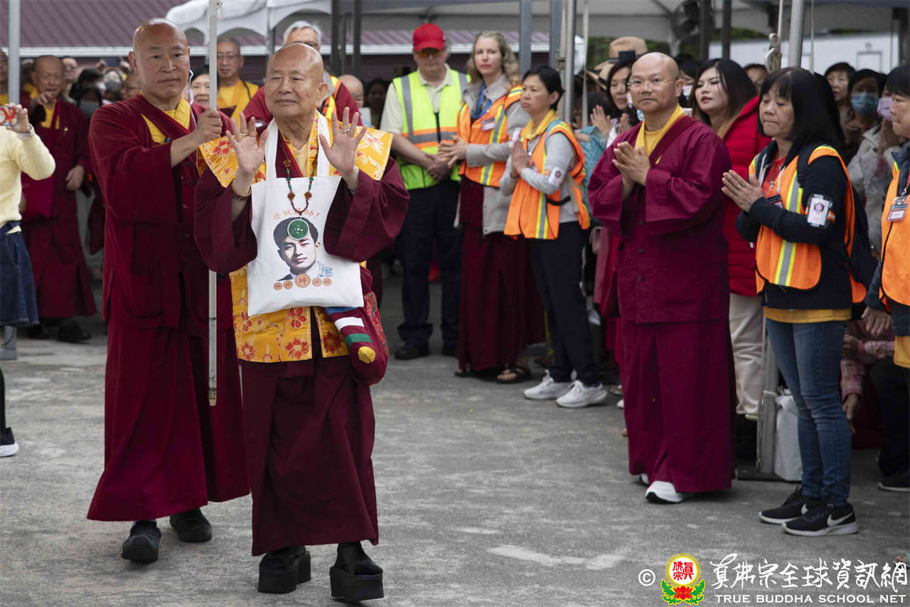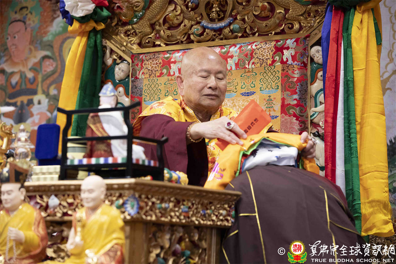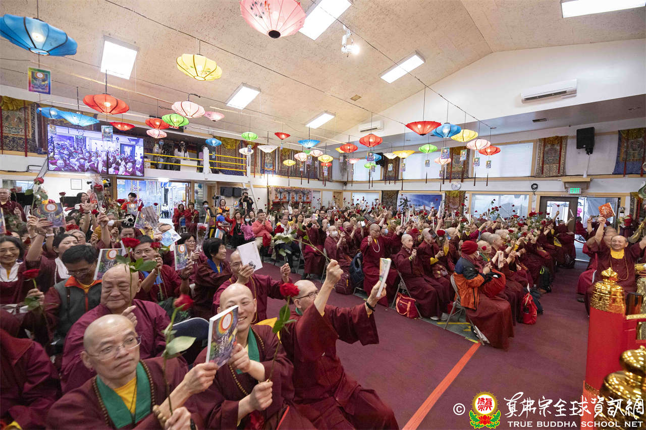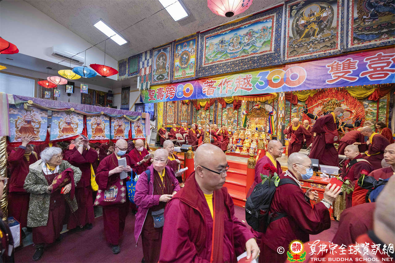 接著請世界真佛宗宗務委員會長蓮花程祖上師、處長們及彩虹雷藏寺住持蓮彥上師、西雅圖雷藏寺代表碧珍上師、台灣雷藏寺住持蓮哲上師出列,頂禮根本上師及壇城三寶,並由會長蓮花程祖上師,代表全球真佛弟子,敬獻賀禮供養真佛宗創辦人無上法王聖尊蓮生活佛。