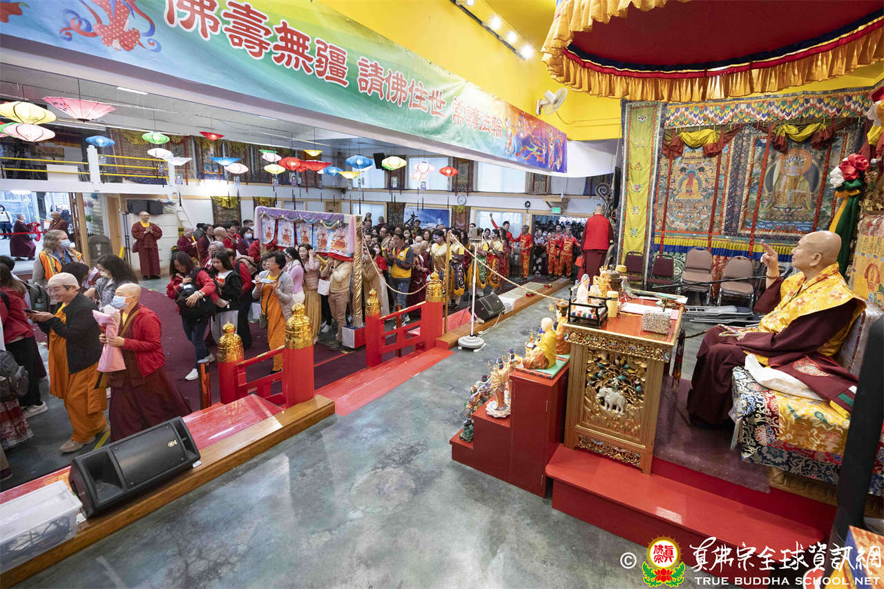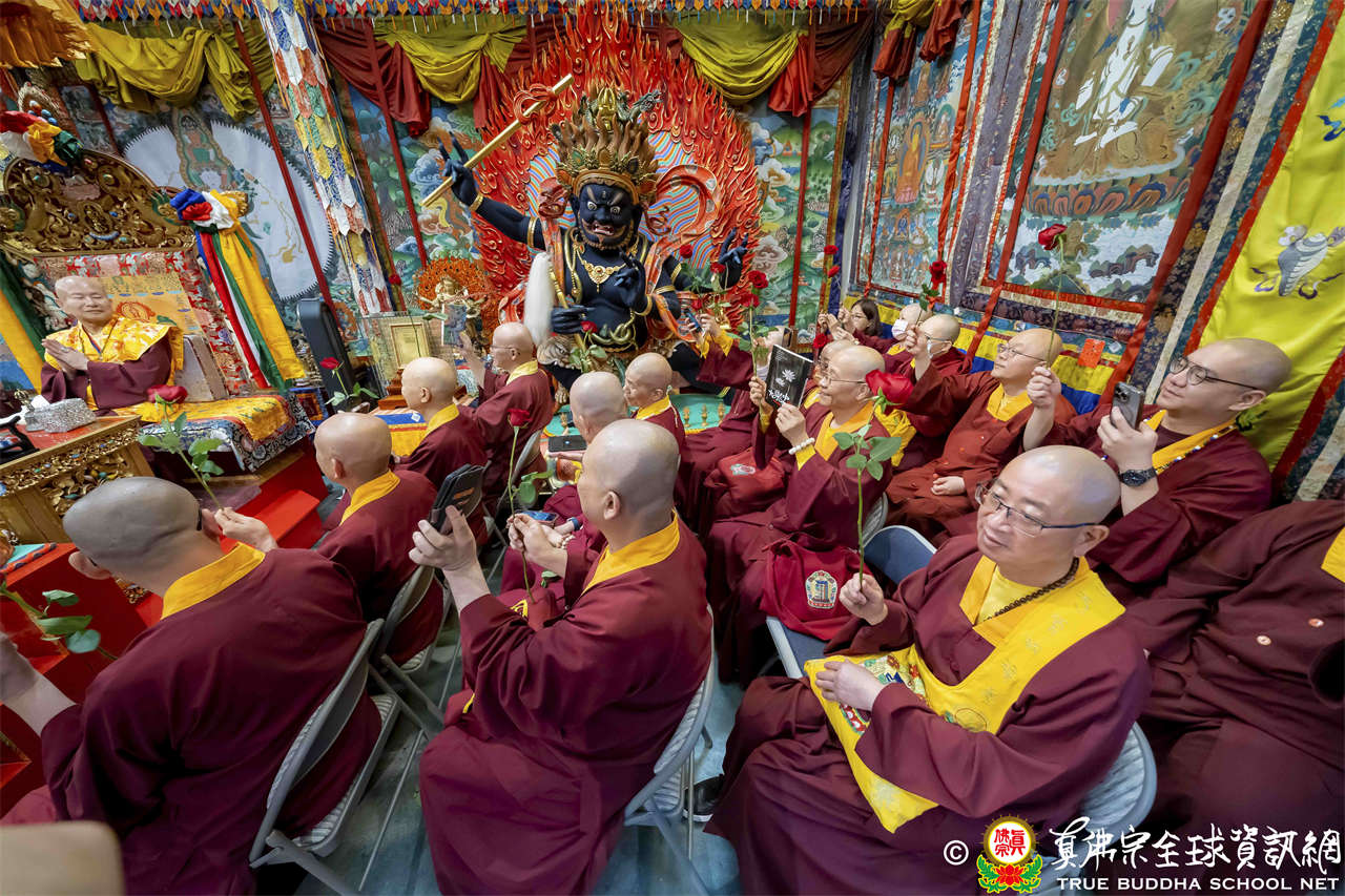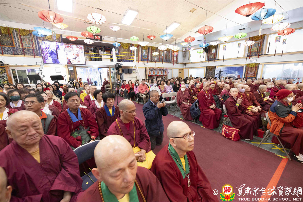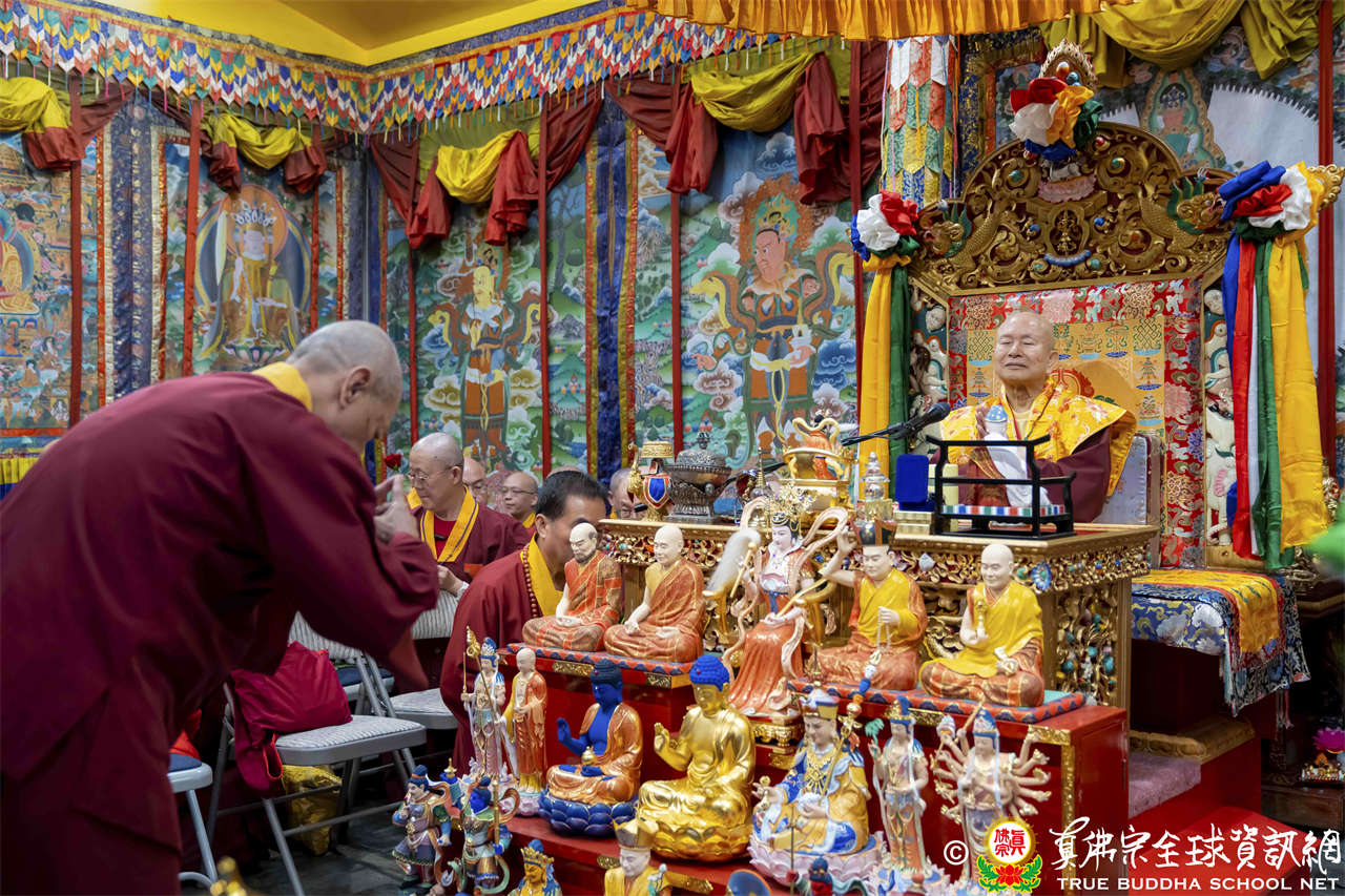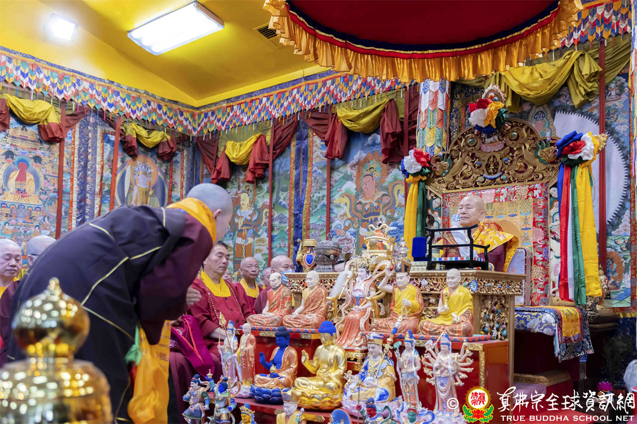 接著請世界真佛宗宗務委員會長蓮花程祖上師、處長們及彩虹雷藏寺住持蓮彥上師、西雅圖雷藏寺代表碧珍上師、台灣雷藏寺住持蓮哲上師出列,頂禮根本上師及壇城三寶,並由會長蓮花程祖上師,代表全球真佛弟子,敬獻賀禮供養真佛宗創辦人無上法王聖尊蓮生活佛。