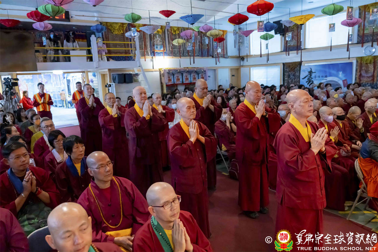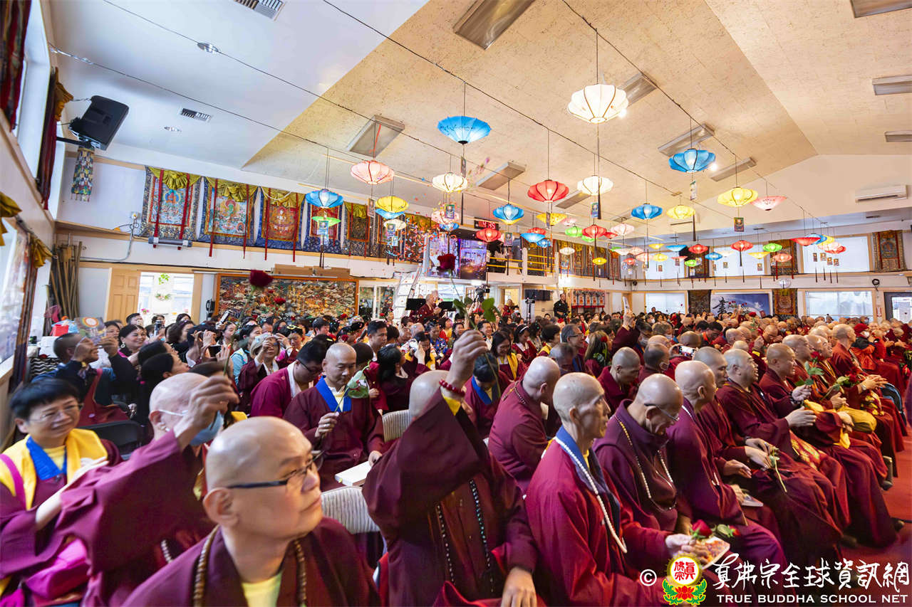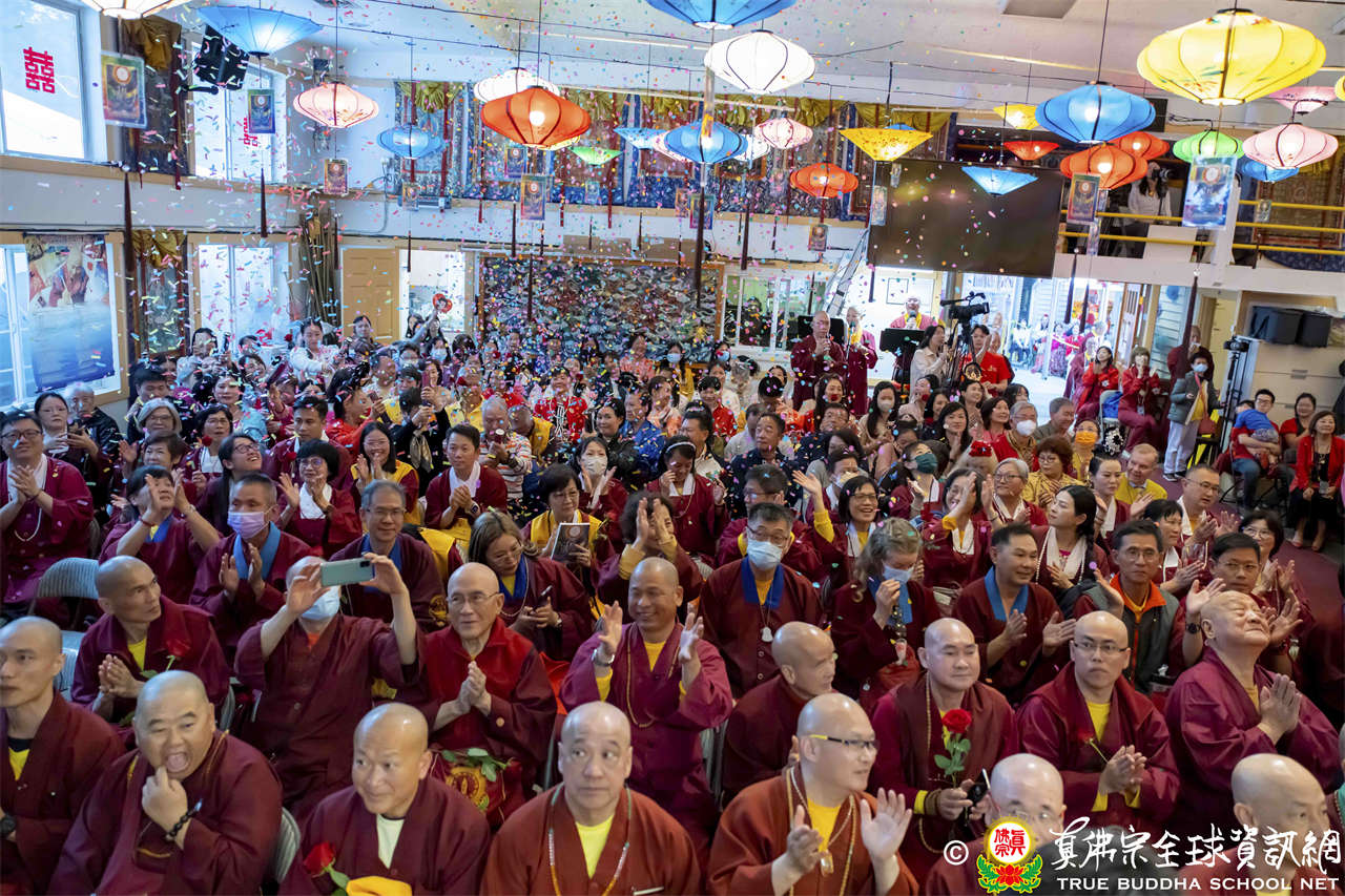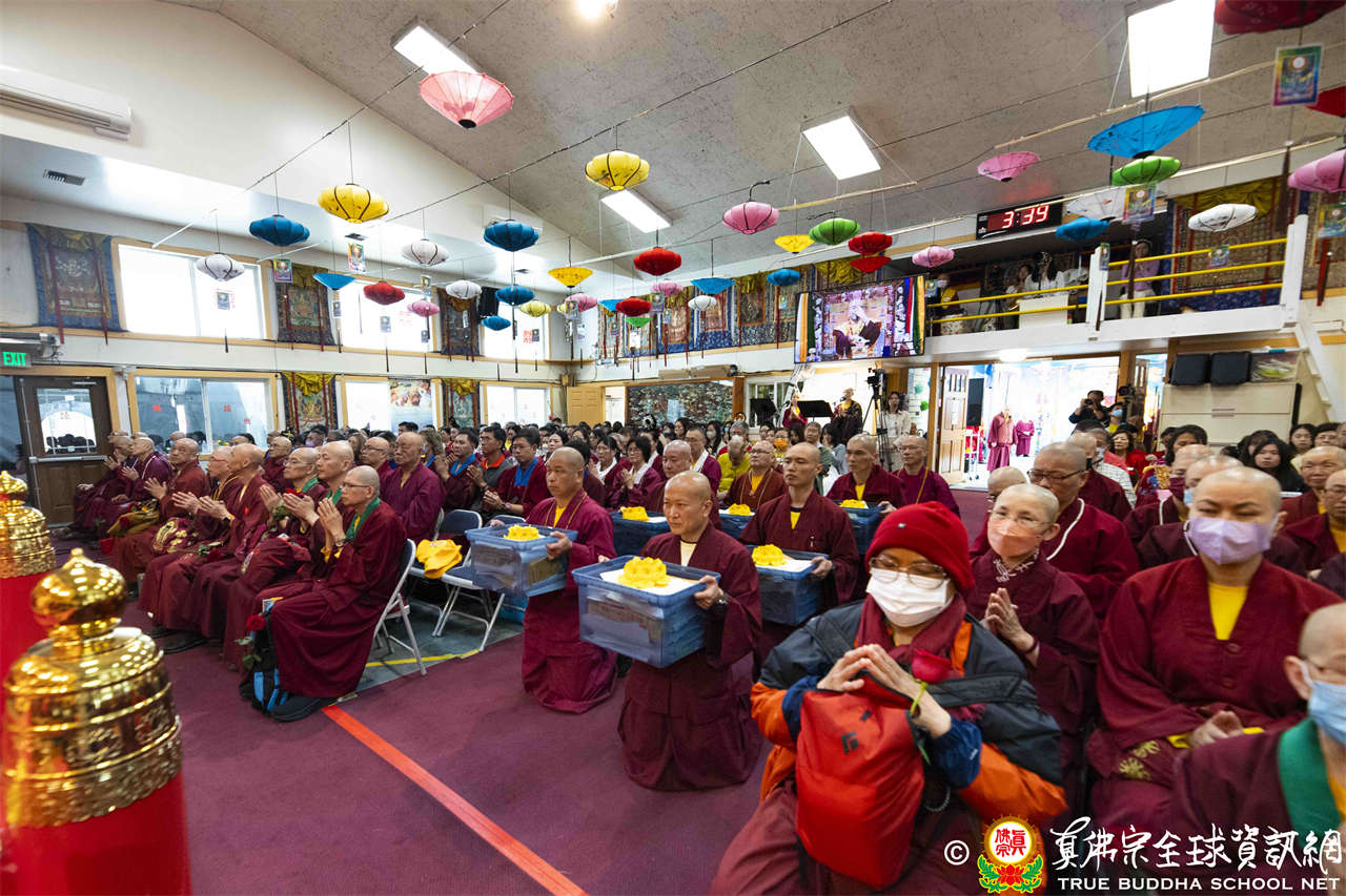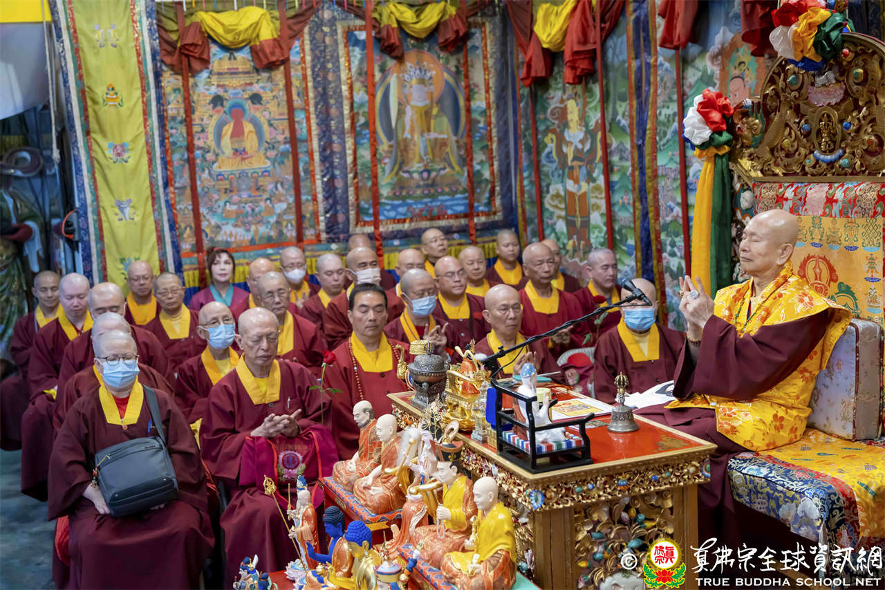 接著請世界真佛宗宗務委員會長蓮花程祖上師、處長們及彩虹雷藏寺住持蓮彥上師、西雅圖雷藏寺代表碧珍上師、台灣雷藏寺住持蓮哲上師出列,頂禮根本上師及壇城三寶,並由會長蓮花程祖上師,代表全球真佛弟子,敬獻賀禮供養真佛宗創辦人無上法王聖尊蓮生活佛。