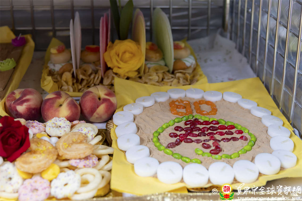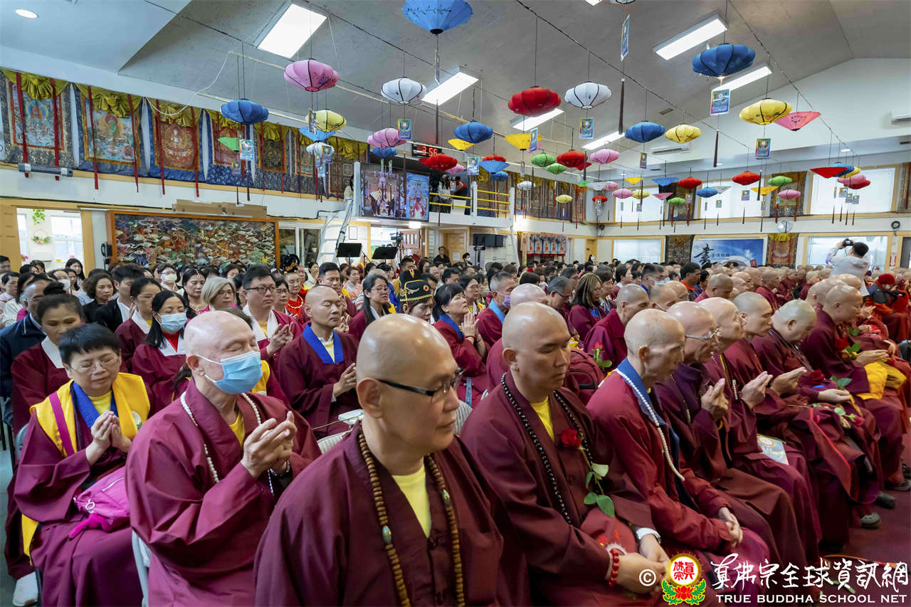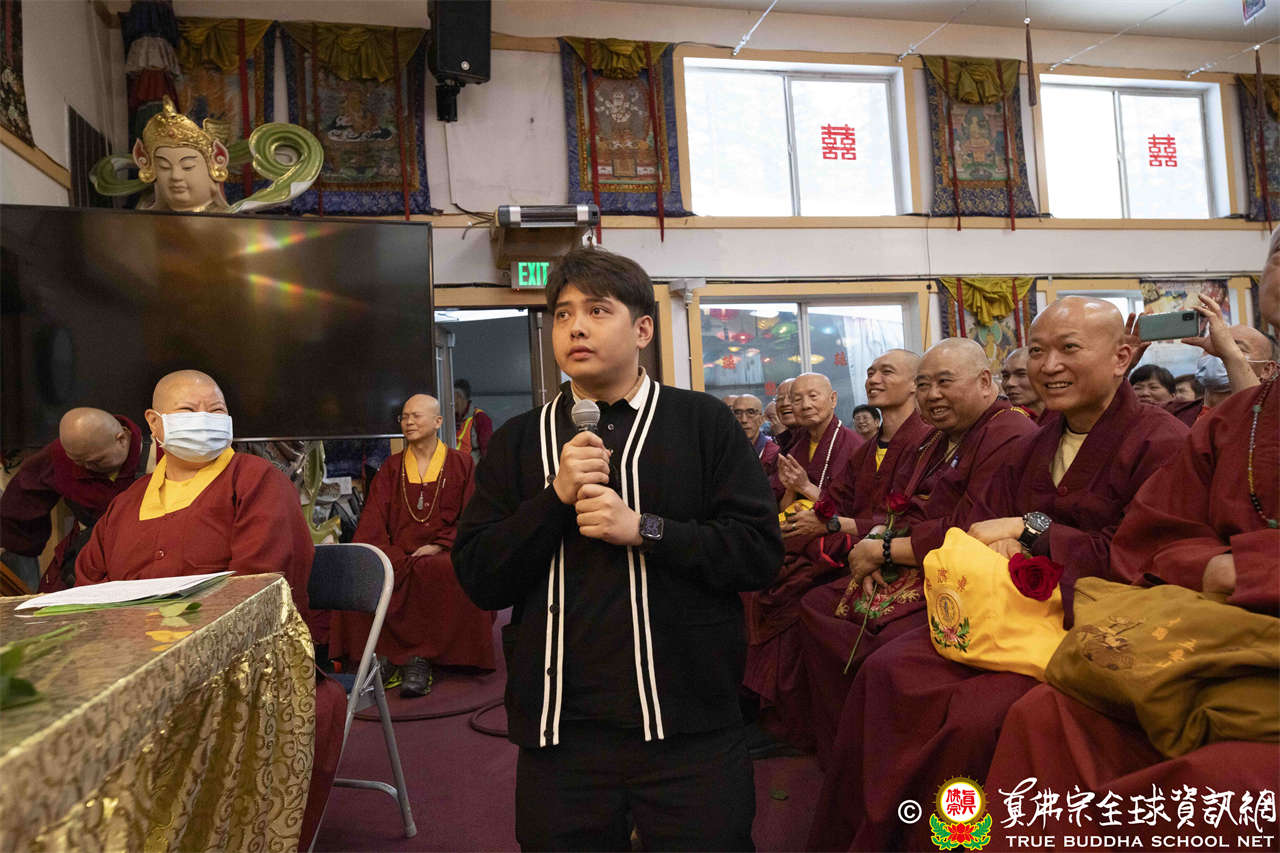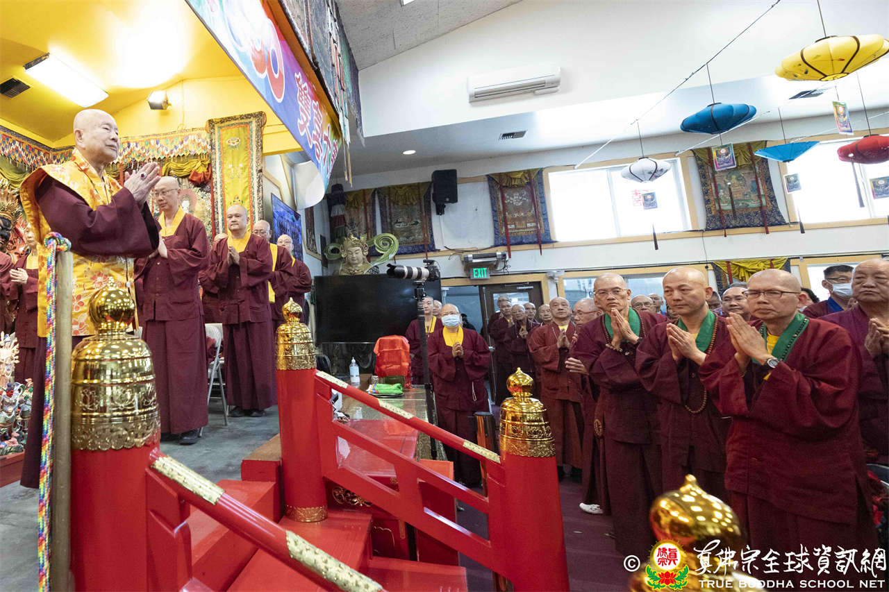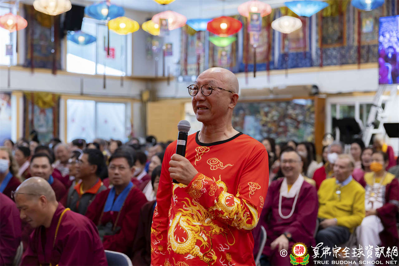 接著請世界真佛宗宗務委員會長蓮花程祖上師、處長們及彩虹雷藏寺住持蓮彥上師、西雅圖雷藏寺代表碧珍上師、台灣雷藏寺住持蓮哲上師出列,頂禮根本上師及壇城三寶,並由會長蓮花程祖上師,代表全球真佛弟子,敬獻賀禮供養真佛宗創辦人無上法王聖尊蓮生活佛。