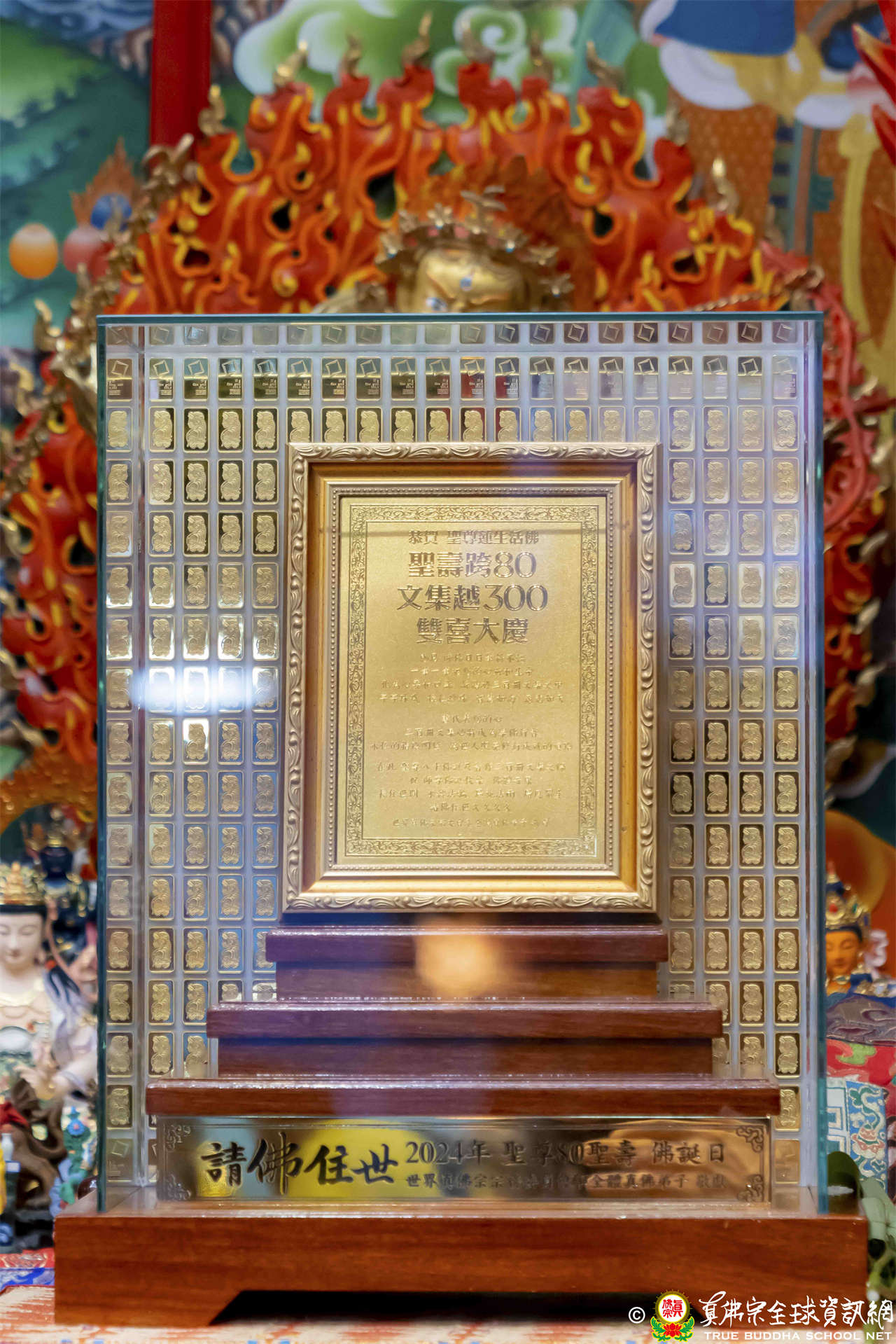 這份禮物由300餘塊純金組成,每一塊黃金背後都有一本書名,代表著師佛的300餘冊文集。