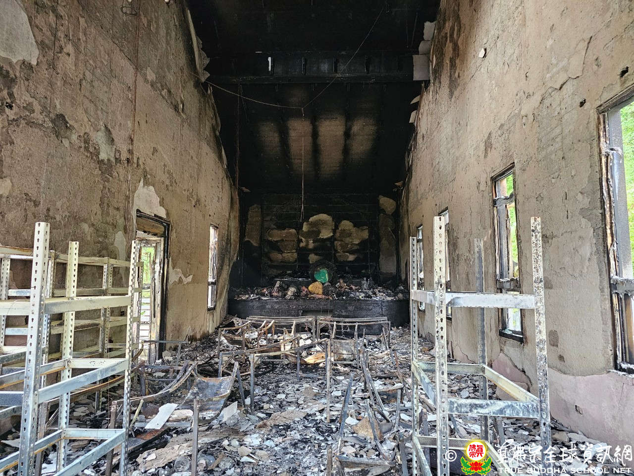 這次的探訪中,親臨火災發生點「觀音殿」,殿內全數燒毀,包含密壇的三十二尊佛像,門窗也因為高溫而變形,地板全是瓦礫碎片,令人觸目驚心。所幸當初天花板使用防火建材,僅是觀音殿內部受災,外牆則是被煙燻黑了,其他各殿無恙,沒有人員傷亡。