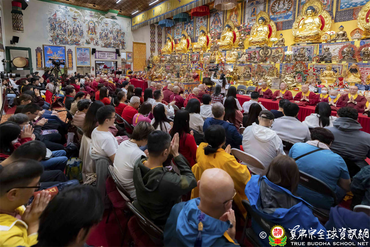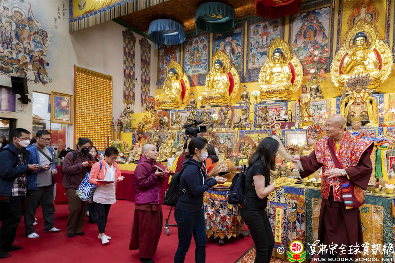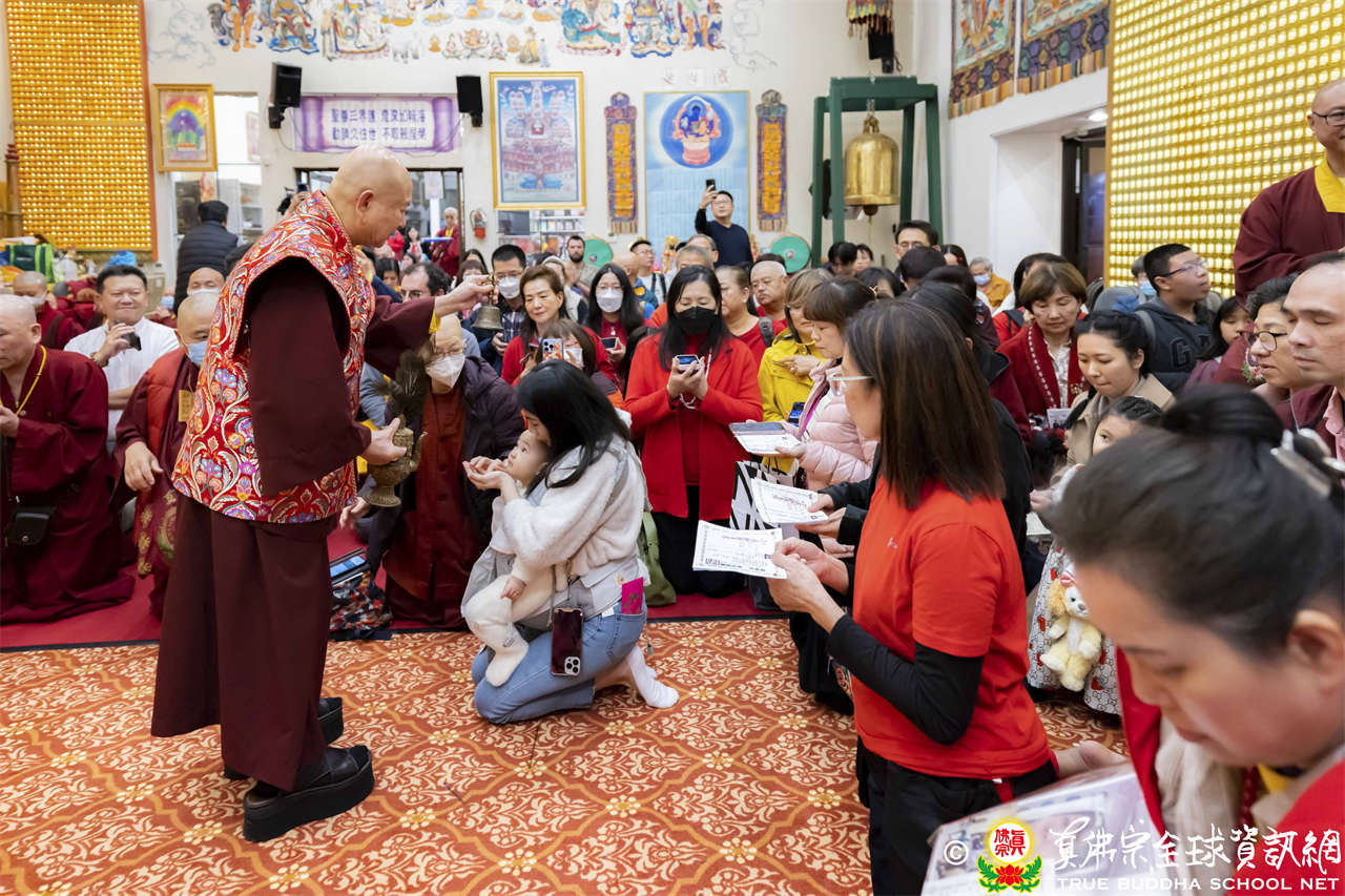 在寶貴的法語開示之後,聖尊為新皈依者進行皈依灌頂,加持佛像、供品以及大悲咒水,最後以拂塵加持與會大眾。聖尊滿懷慈悲,為了讓普羅大眾皆能領會深奧佛法,以最樸實無華的話語開演最高深的智慧,諄諄教導,與會眾人法喜充滿。