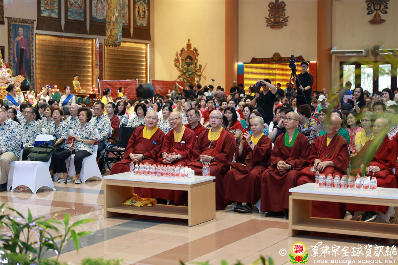 今日蒞臨的上師除了蓮飛上師,還有大覺堂的蓮樣,蓮妗上師,及馬來西亞的蓮一上師。下午三點多,整個大殿已經座無虛席。節目開始,首先大眾起立唱國歌。然後是敬德學校的小學生表演昂格浪樂曲,印尼雷藏寺佛學班學生唱“感恩真佛”宗歌,大屏幕上放出師佛蒞臨為印尼雷藏寺開光安座的照片,以及一些前輩們的照片,令人勾起無限回憶。