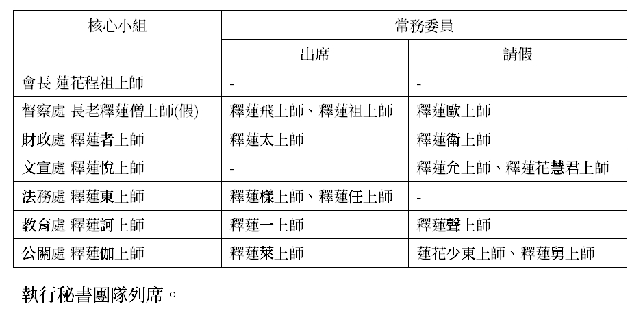 經過一番討論後,各處所討論的方案,亦讓該處的常務委員一起跟進,故能輔助各處處長,將各項宗務繼續向前推動,訂定下一次會議日期後,核心小組暨常務委員第七次會議圓滿結束。