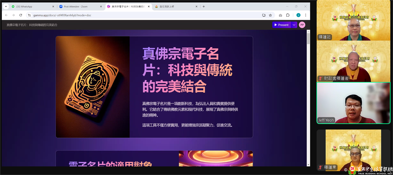 本次會議的另外一項重點即是,督察處邀請國暉師兄首次報告「電子名片」設計。真佛宗的電子名片,是科技與傳統的完美結合,比以前的二維碼更進階,稱為NFC卡。適用對象為真佛宗弘法人員或貴賓。NFC卡的革新概念: